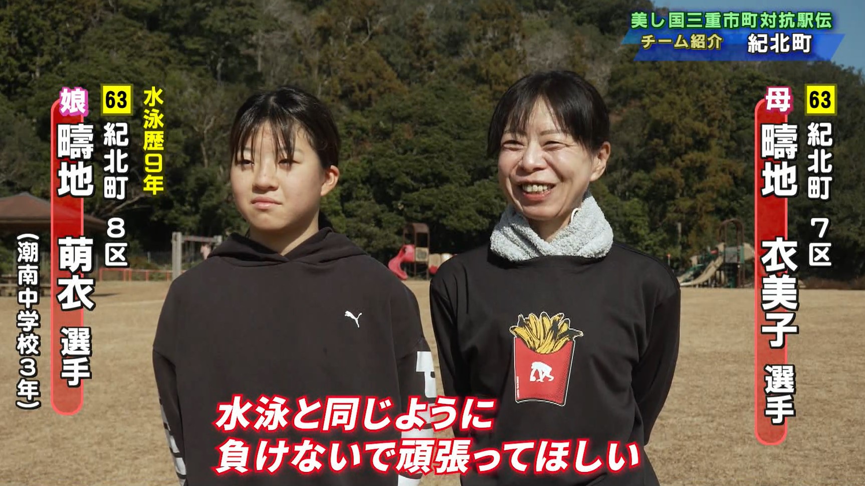 娘の萌衣選手が「(親子でエントリー)うれしいです!」と話すと、母の衣美子選手も「水泳と同じように負けないで頑張ってほしい。肺活量が鍛えられているのでいかして頑張って走りたい」と、親子でチームを盛り上げます。