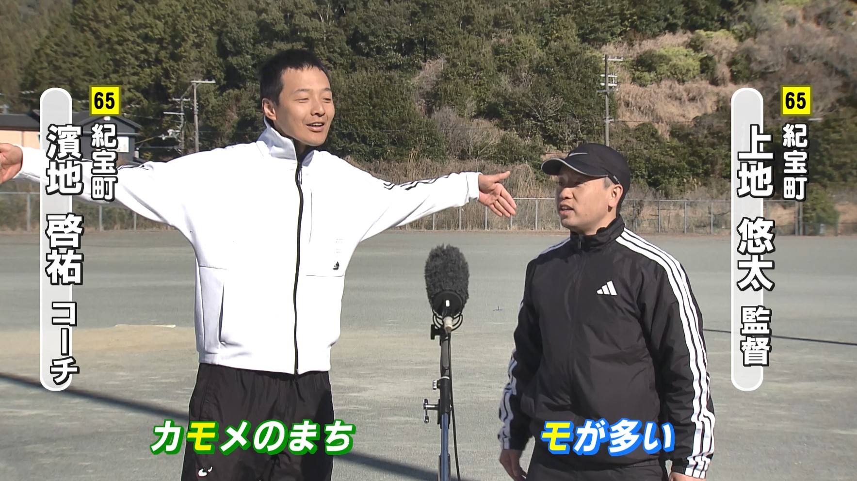 毎年特徴あるチーム紹介をしている紀宝町チーム。今年は濱地啓祐コーチと上地悠太監督が漫才で紹介しました。