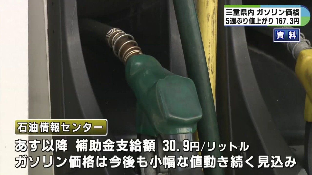経済産業省によりますと、20日時点でレギュラーガソリンの三重県内の平均小売価格は、前の週から1.7円値上がりし、1リットルあたり167.3円と、5週ぶりに前の週の価格を上回りました。