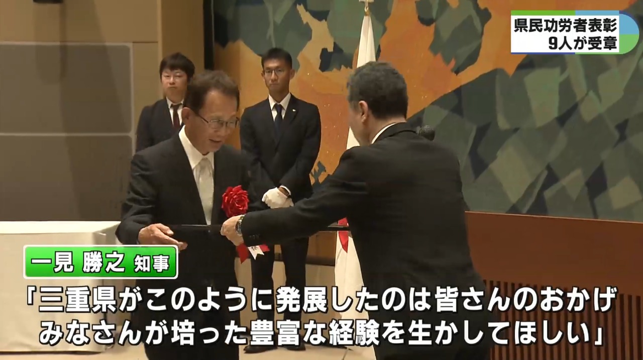 この日は、表彰式が行われ、三重県の一見知事が、一人一人に県民功労章と表彰状を渡した後「三重県がこのように発展したのは、皆さんの長年の取り組みのおかげです。より良い三重県を作っていくためにも、みなさんがこれまで培った豊富な経験を生かして、協力していきたい」と話しました。