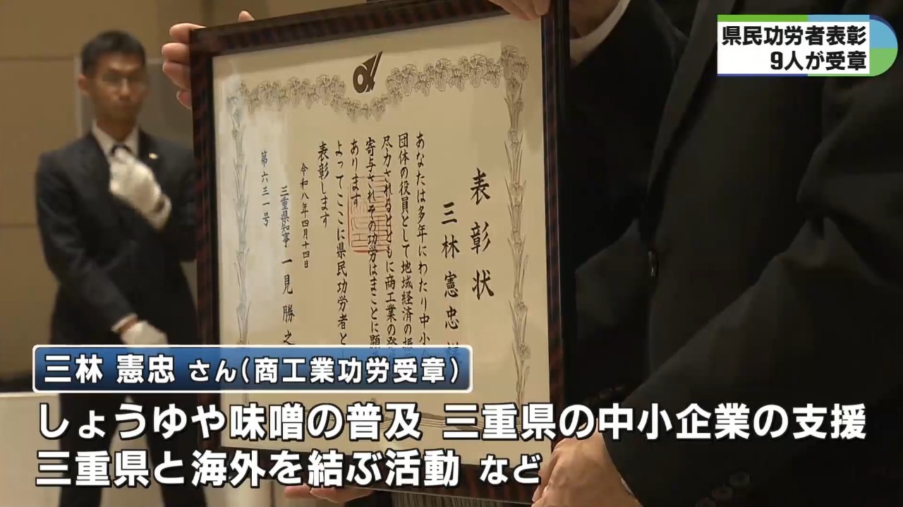 今年は、産業や生活などの分野で9人が受章しました。そのうち、桑名市に本社を置くヤマモリの三林憲忠会長は、しょうゆやみその普及を行ったほか、三重県の中小企業の支援や、三重県と海外を結ぶ活動などが評価され、商工業功労を受章しました。