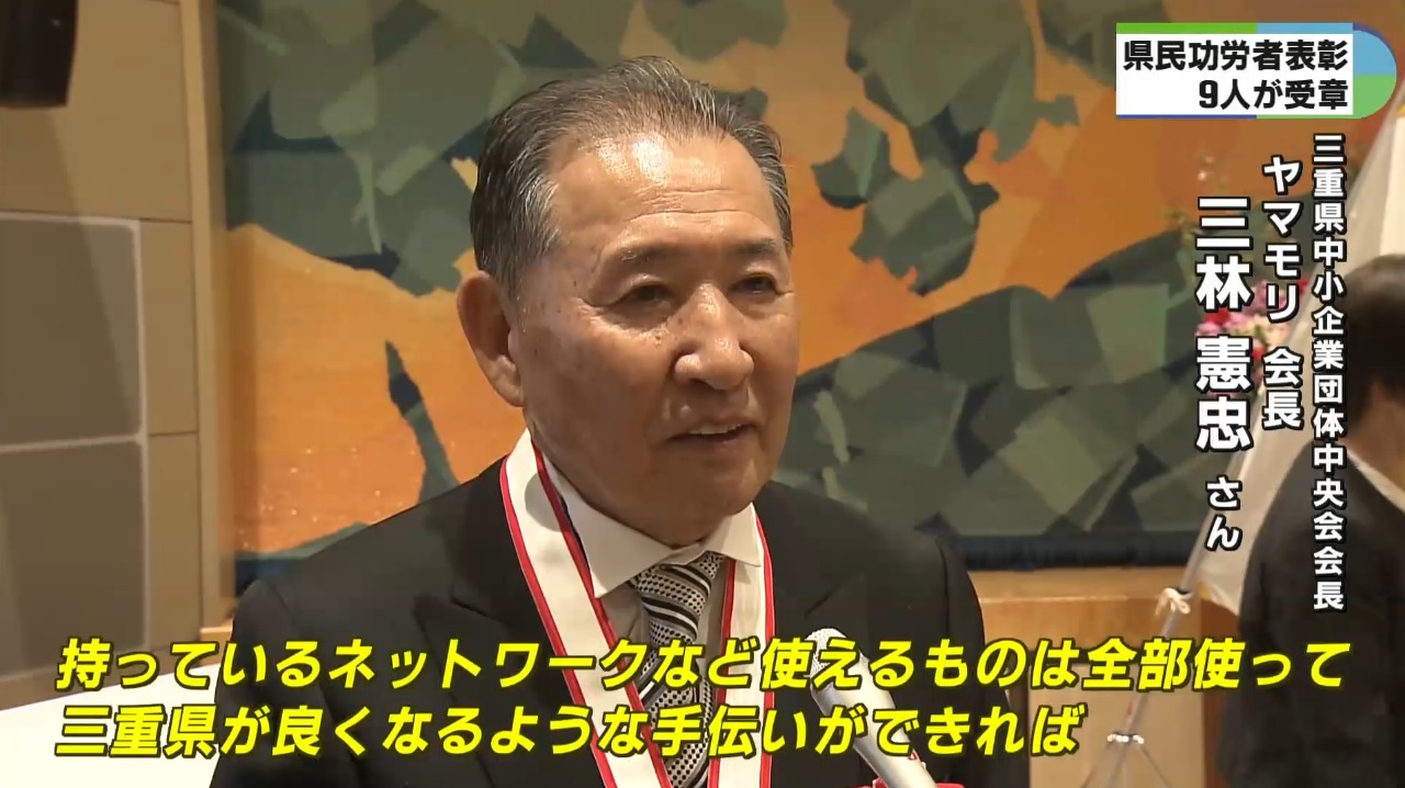 三重県中小企業団体中央会会長を務める、ヤマモリ会長の三林憲忠さんは「これからもっと、しっかりやるべきという意味合いで章をいただいたと思う。持っているネットワークなど、使えるものは全部使って、三重県が良くなるような手伝いができれば」と話していました。