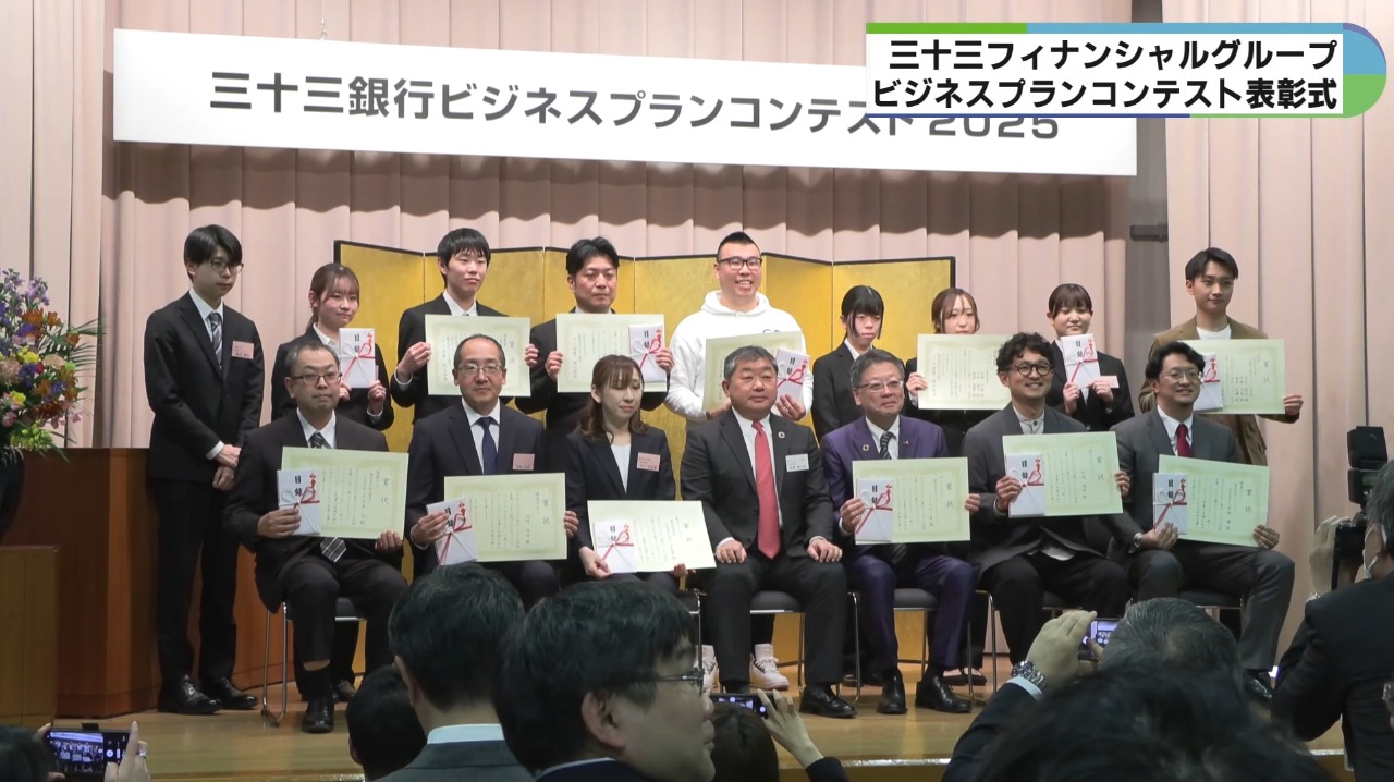 起業家や学生らの優れたビジネスプランを表彰してサポートすることで、地域経済の活性化につなげようと三十三フィナンシャルグループが開いたもので、今回は86件の応募の中から書類、プレゼンテーション審査を行い、11件のビジネスプランが選ばれました。