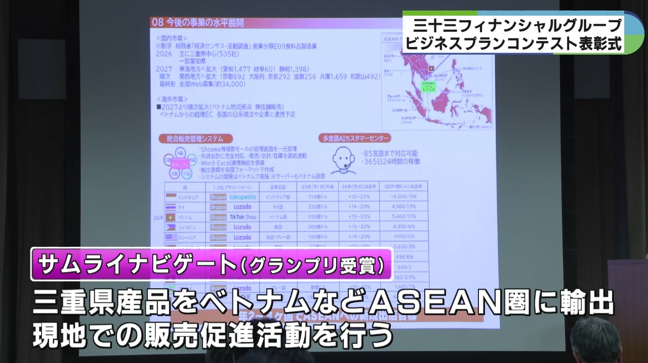 その後、受賞者によるビジネスプランの発表が行われ、グランプリを受賞した四日市市のサムライナビゲートは、三重県産品をベトナムをはじめとするASEAN地域に輸出し、現地で販売促進活動するプランを提案しました。