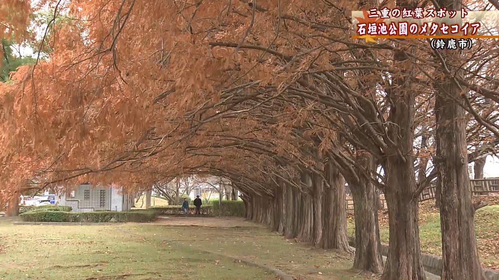 三重県鈴鹿市の石垣池公園に立ち並ぶ、メタセコイアの紅葉が見ごろを迎えています。