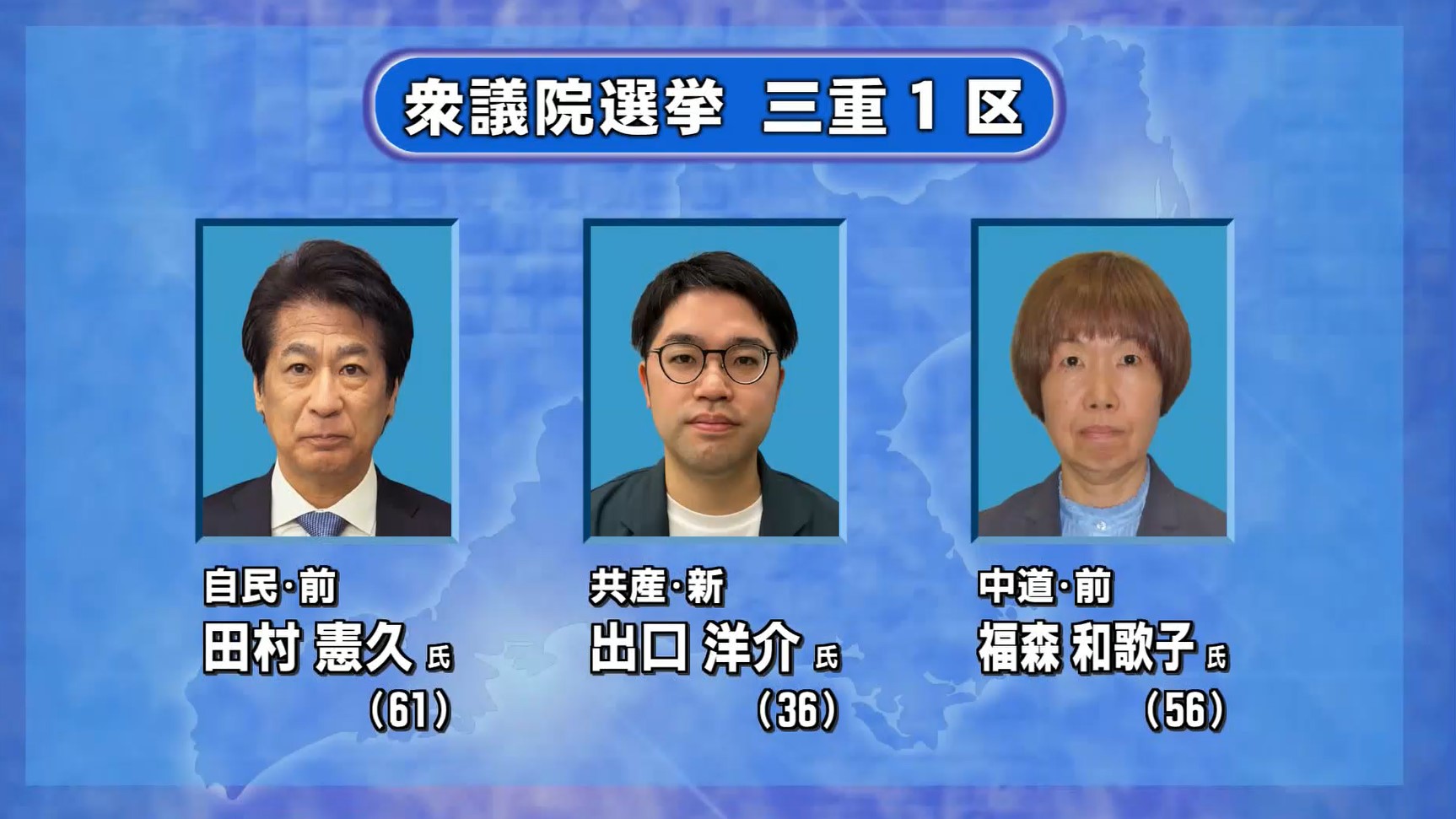 届け出順に、津市と松阪市を選挙区とする三重1区には、自由民主党・前職の田村憲久氏、日本共産党・新人の出口洋介氏、中道改革連合・前職の福森和歌子氏の3人が立候補しました。