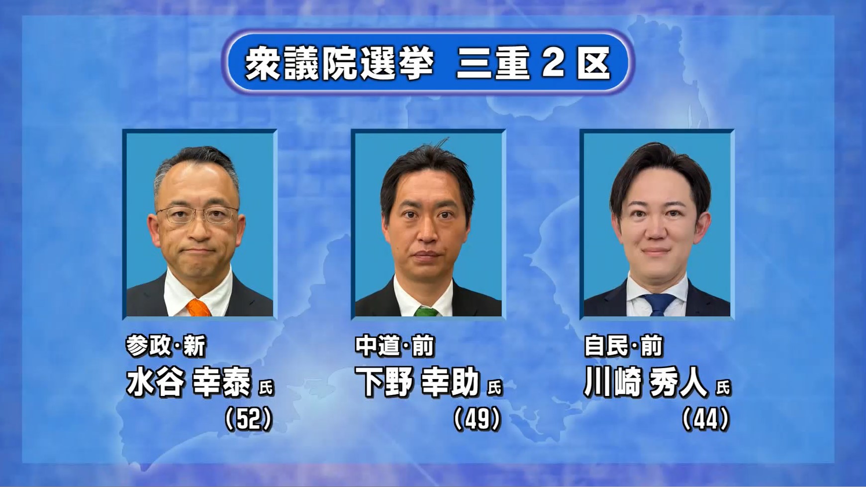 四日市市南部、鈴鹿市などを選挙区とする三重2区には、参政党・新人の水谷幸泰氏、中道改革連合・前職の下野幸助氏、自由民主党・前職の川崎秀人氏の3人が立候補しました。