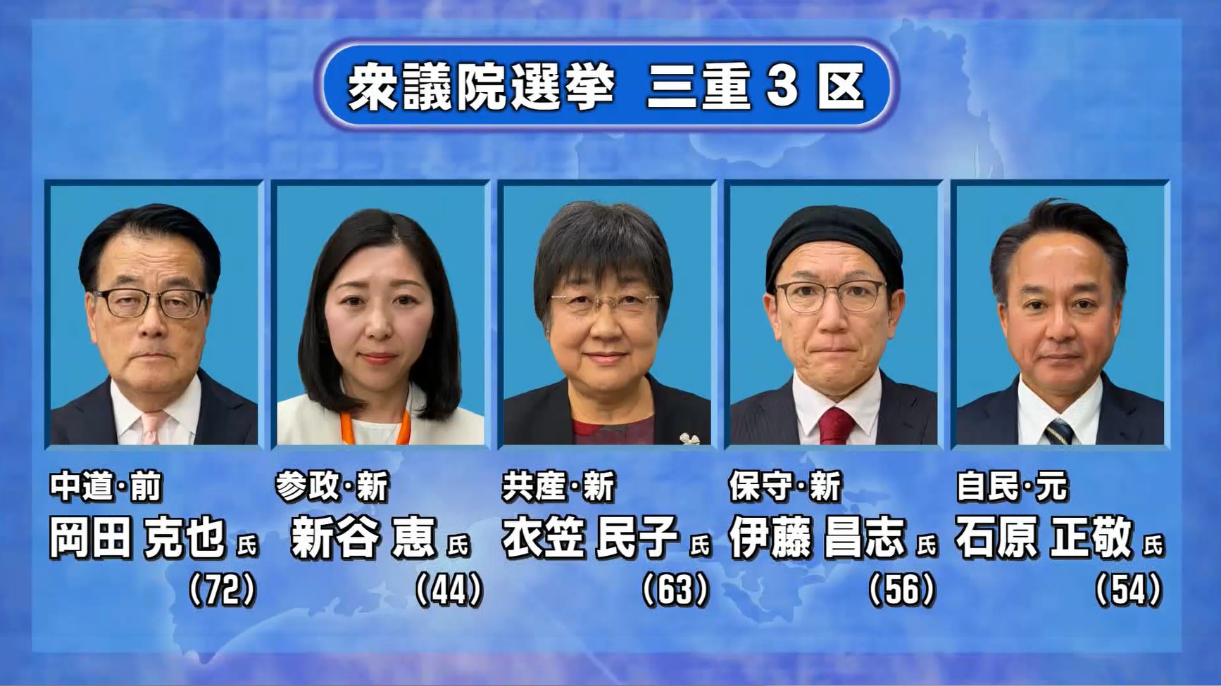 四日市市北部、桑名市、いなべ市などを選挙区とする三重3区には、中道改革連合・前職の岡田克也氏、参政党・新人の新谷恵氏、日本共産党・新人の衣笠民子氏、日本保守党・新人の伊藤昌志氏、自由民主党・元職の石原正敬氏の5人が立候補しました。