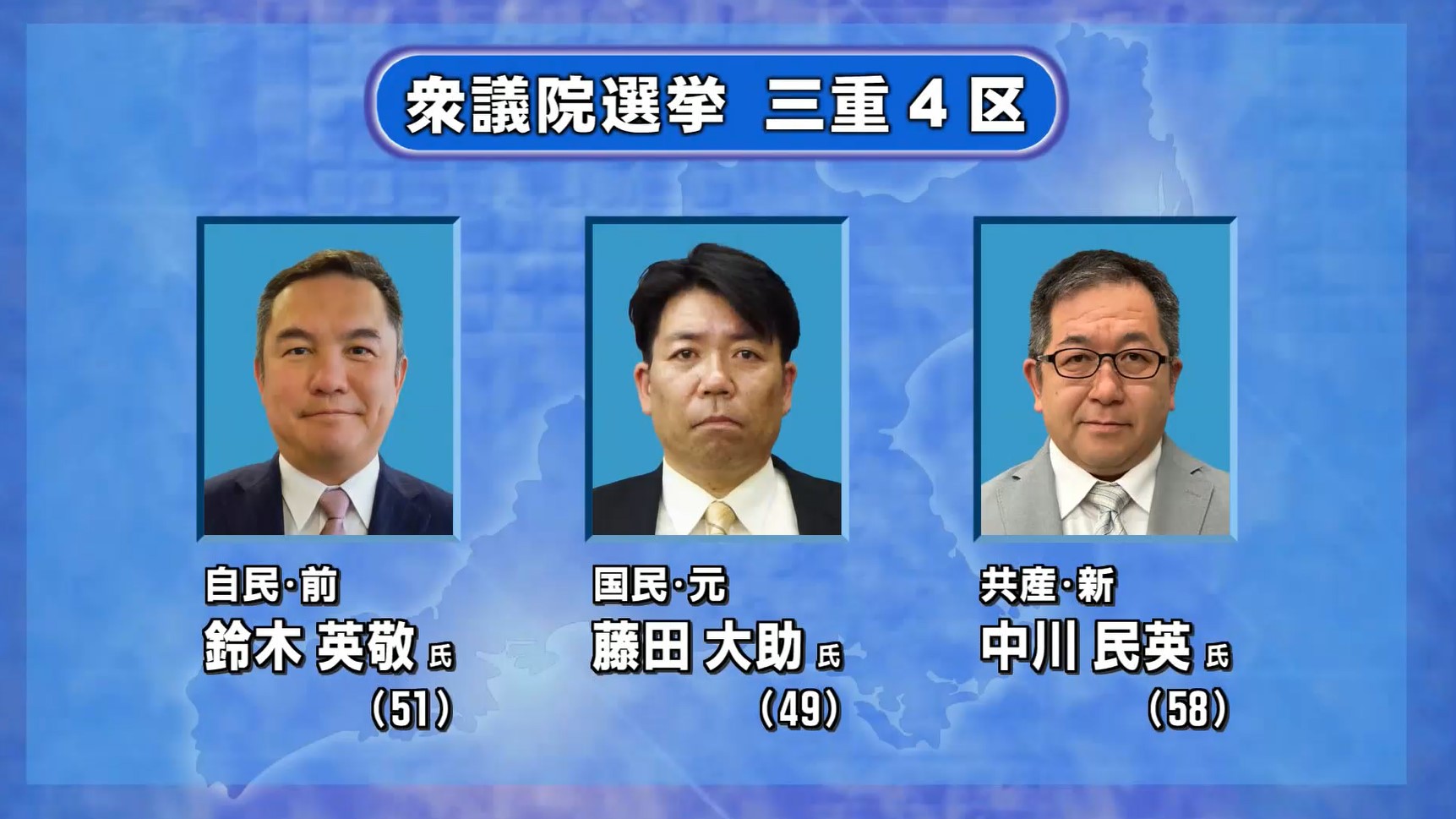 伊勢市、志摩市、鳥羽市などを選挙区とする三重4区には、自由民主党・前職の鈴木英敬氏、国民民主党・元職の藤田大助氏、日本共産党・新人の中川民英氏の3人が立候補しました。