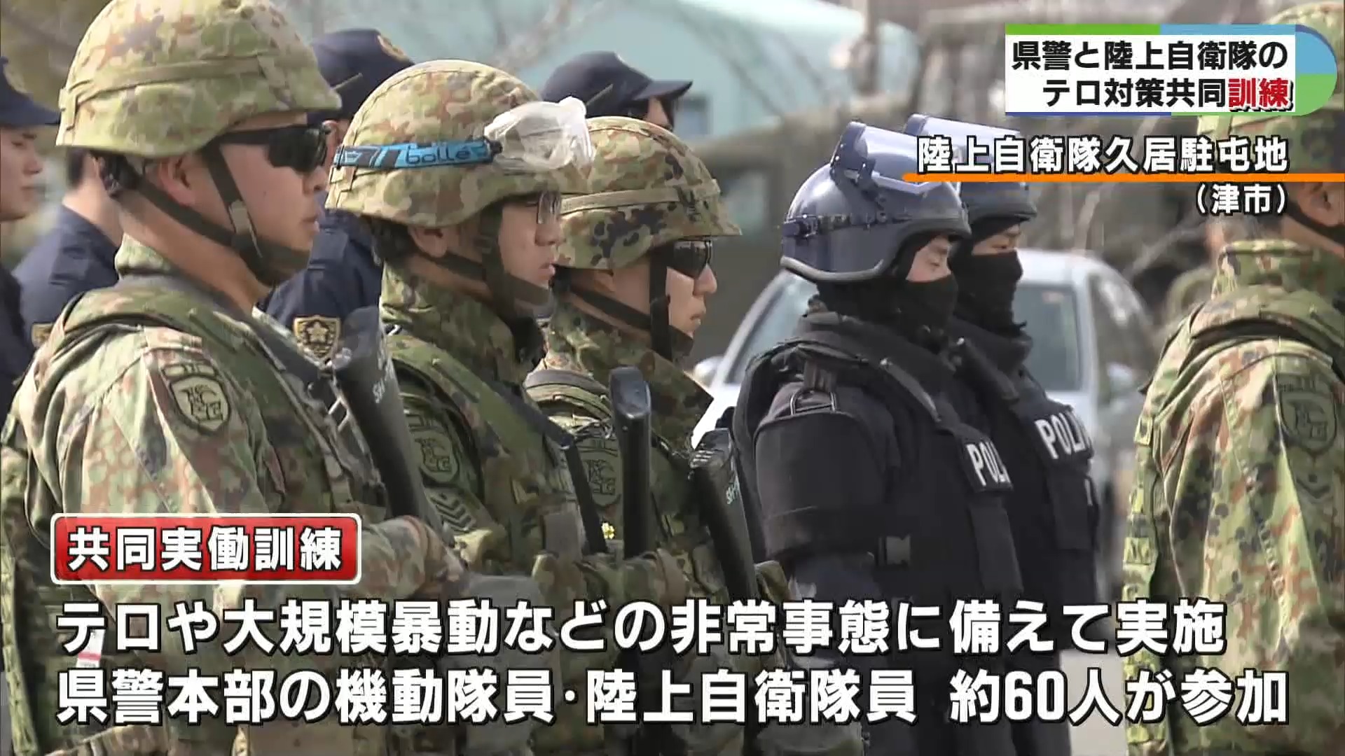 三重県警察と陸上自衛隊によるテロを想定した共同訓練が24日、三重県津市にある陸上自衛隊久居駐屯地で行われました。
