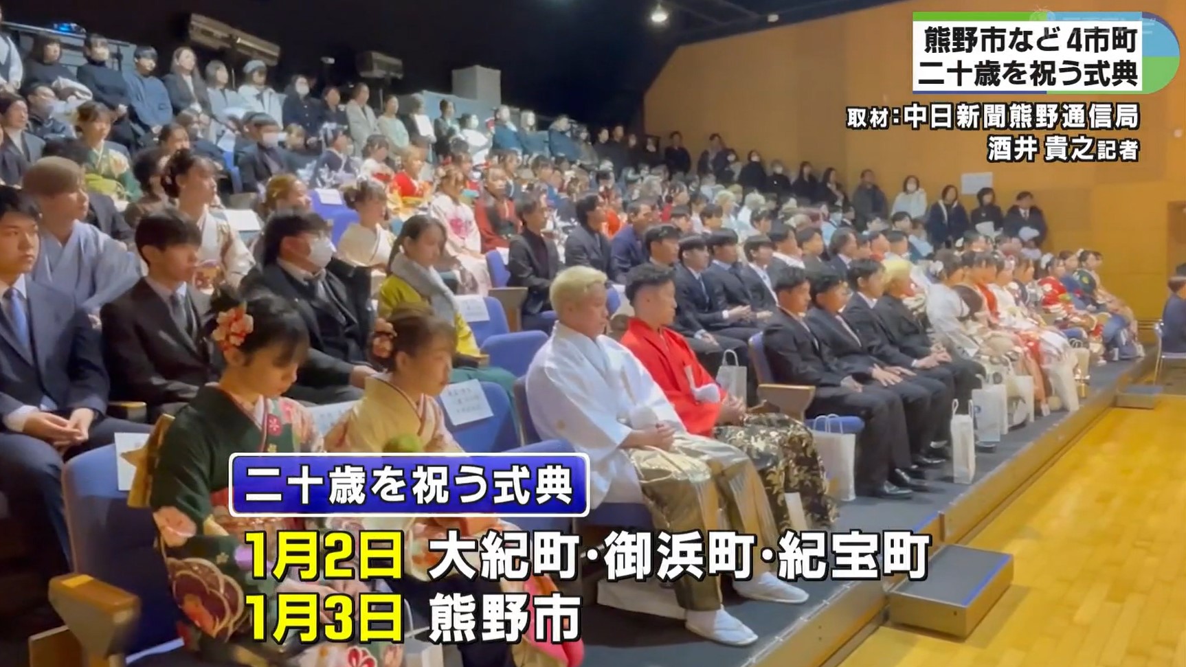1月12日の「成人の日」を前に、三重県熊野市など、県南部の4つの市町では、20歳を迎える人たちを祝う式典が2日と3日、それぞれ開かれました。