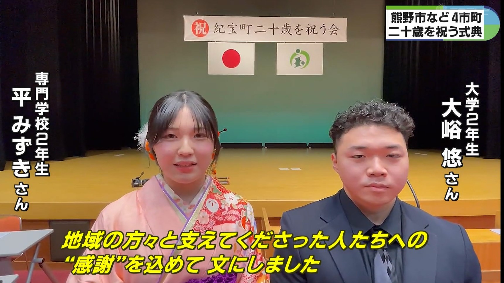 また、紀宝町では、専門学校2年の平みずきさんと、大学2年の大峪悠さんが出席者を代表して誓いの言葉を述べました。