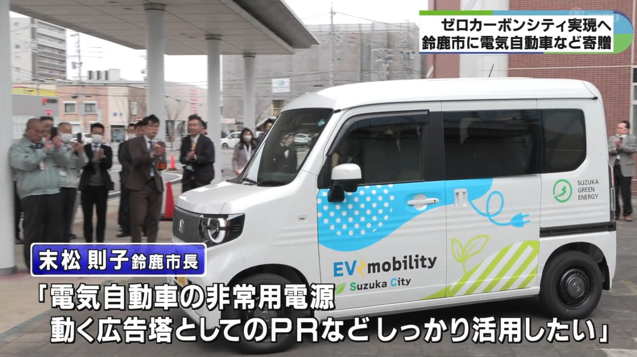 贈呈式には鈴鹿市の末松則子市長と、東邦ガスや三十三銀行など4者が共同で設立した鈴鹿グリーンエナジーの鈴木賢一代表取締役が出席。電気自動車1台と充電器1台が寄贈されました。