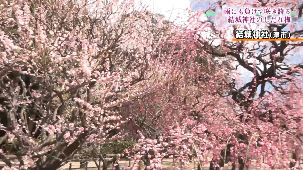 三重県内有数のしだれ梅の名所として知られる津市の結城神社で、しだれ梅が見ごろを迎えています。