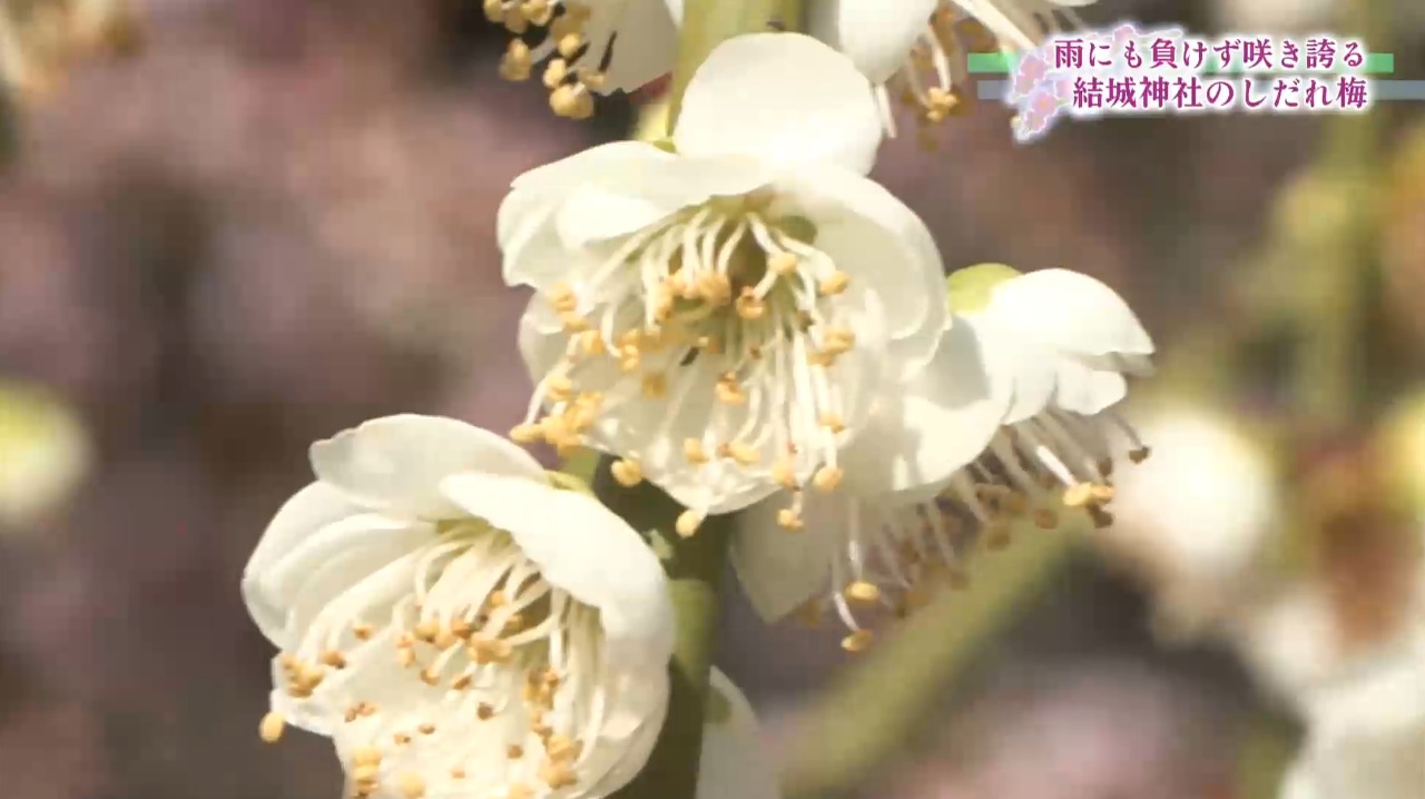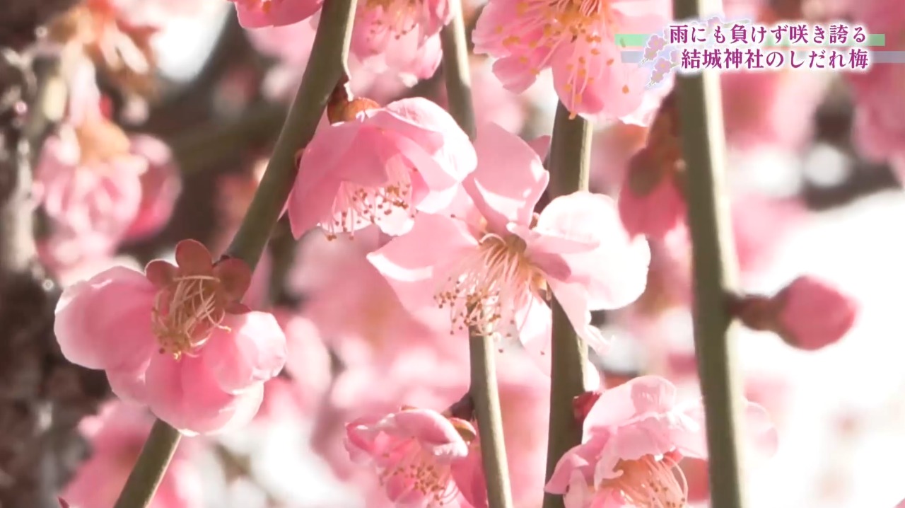雨にも負けずに咲き誇る 名所・結城神社でしだれ梅見ごろ