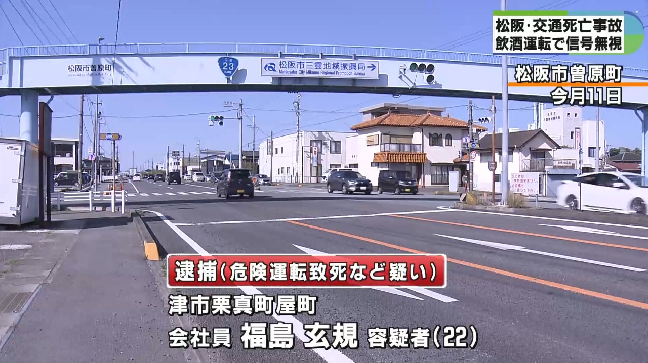 三重県松阪市の国道で酒を飲んで車を運転した上、赤信号を無視して衝突事故を起こし、男性を死亡させたとして22歳の会社員の男が逮捕されました。