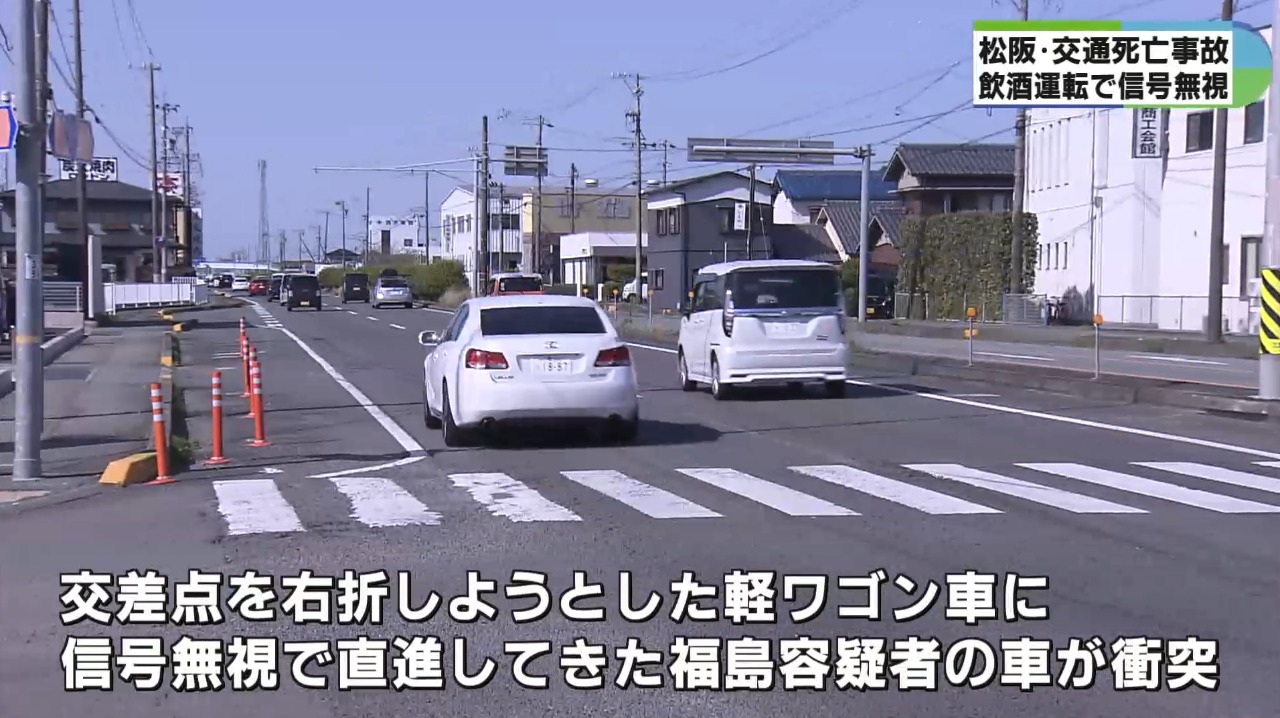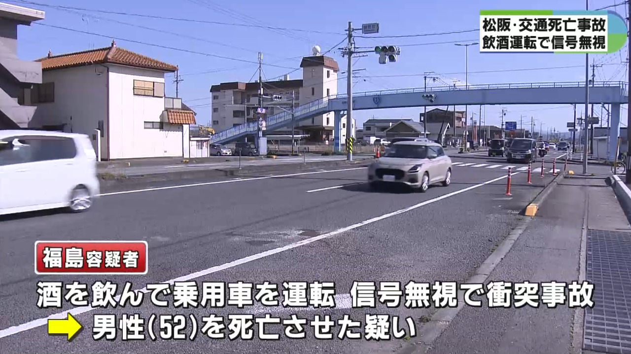 警察によりますと、福島容疑者は今月11日の午前6時20分頃、松阪市曽原町の国道23号の交差点で酒を飲んで乗用車を運転した上、赤信号を無視して軽ワゴン車と衝突し、52歳の男性を死亡させた疑いがもたれています。
