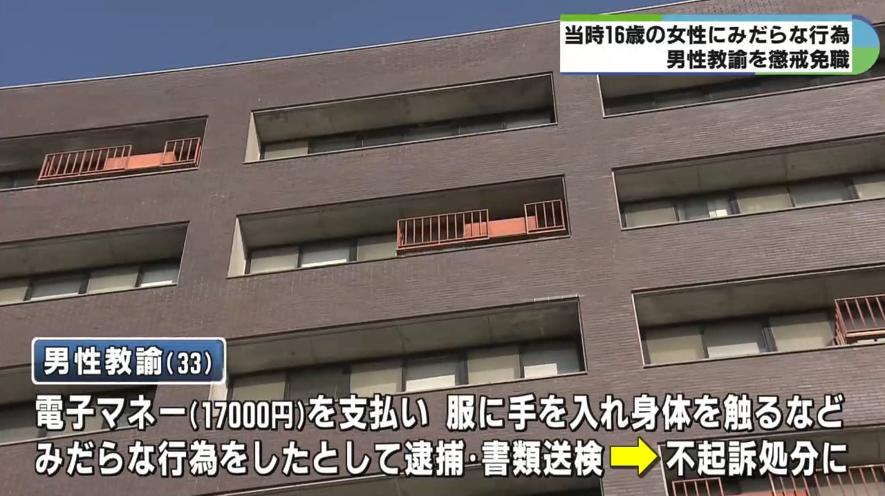 1万7000円支払い身体触る 当時16歳女性へのみだらな行為で教諭を懲戒免職