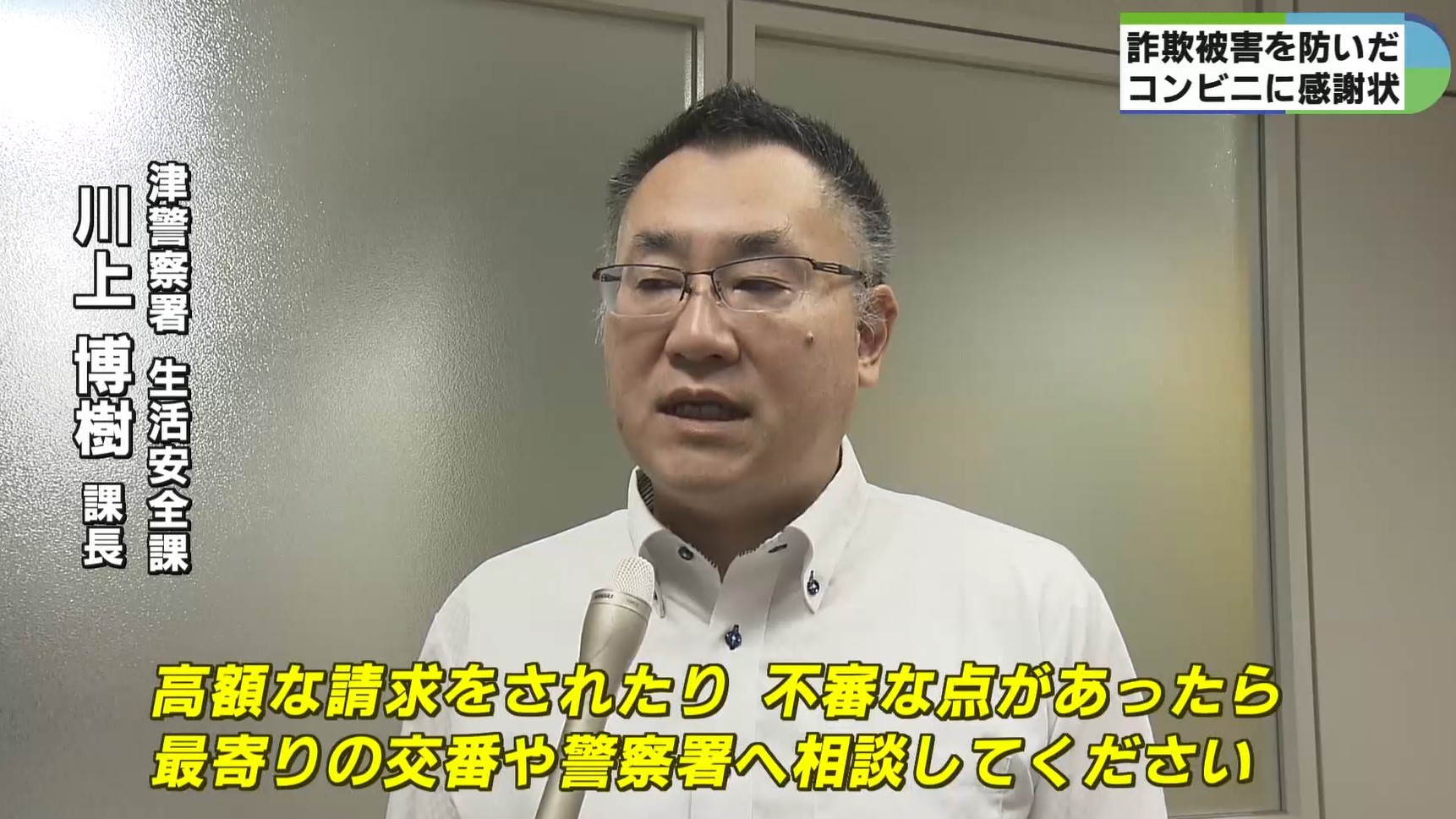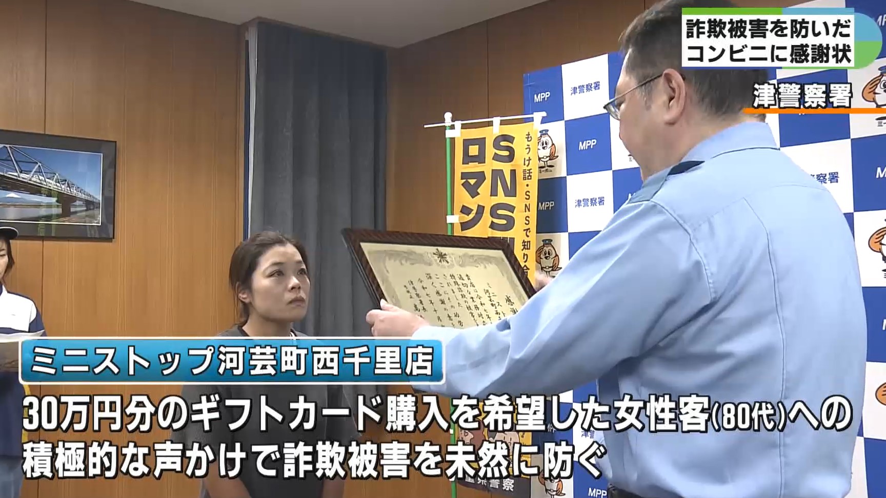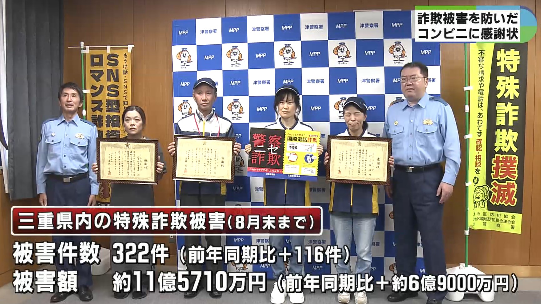 積極的な声かけで、特殊詐欺被害を未然に防いだ三重県津市内のコンビニエンスストア3店舗に、津警察署から感謝状が贈られました。