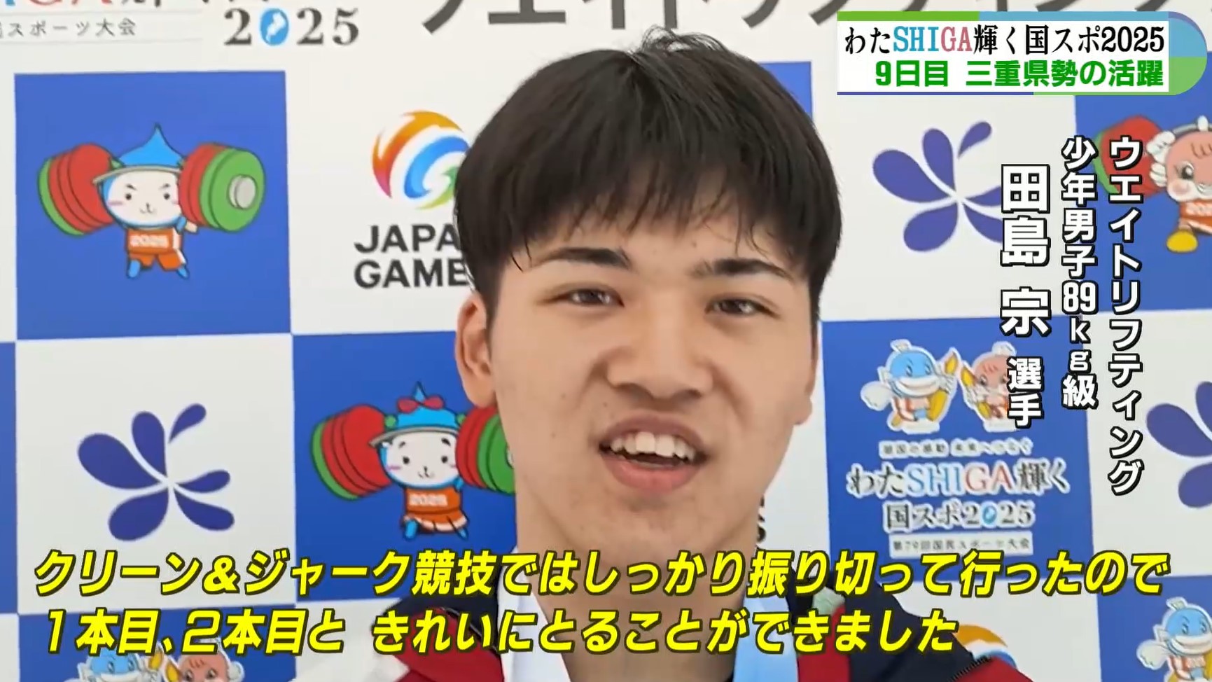 ウエイトリフティング少年男子89キロ級の田島宗選手は、クリーン&ジャークで大会新記録となる160キロを上げ優勝。スナッチでも3位に入りトータル1位に輝きました。