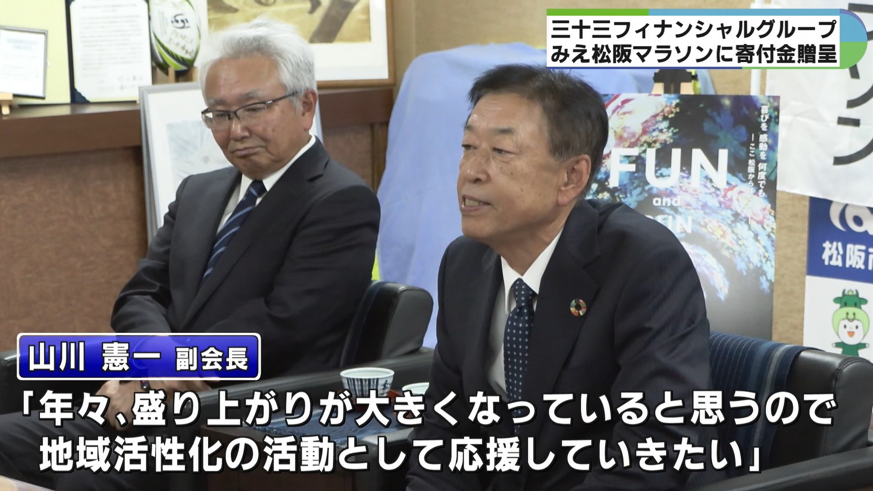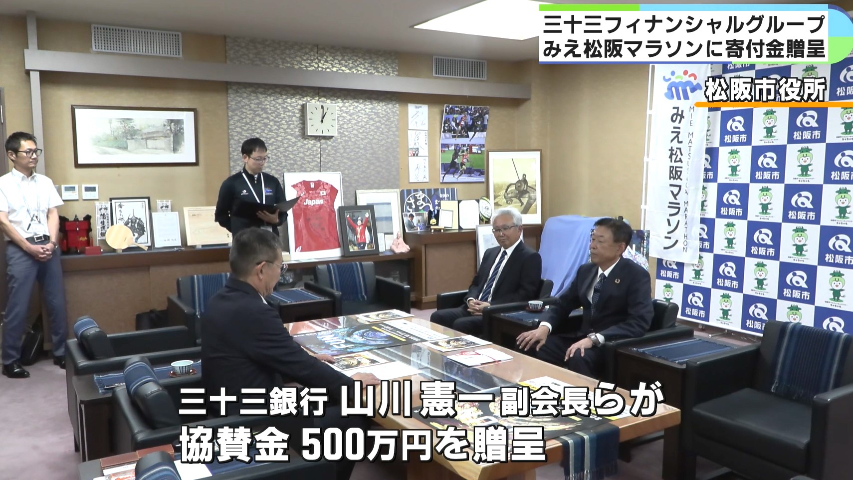 三重県唯一のフルマラソン「みえ松阪マラソン」を支援しようと、7日、三十三フィナンシャルグループから「みえ松阪マラソン」の実行委員会に協賛金が贈られました。