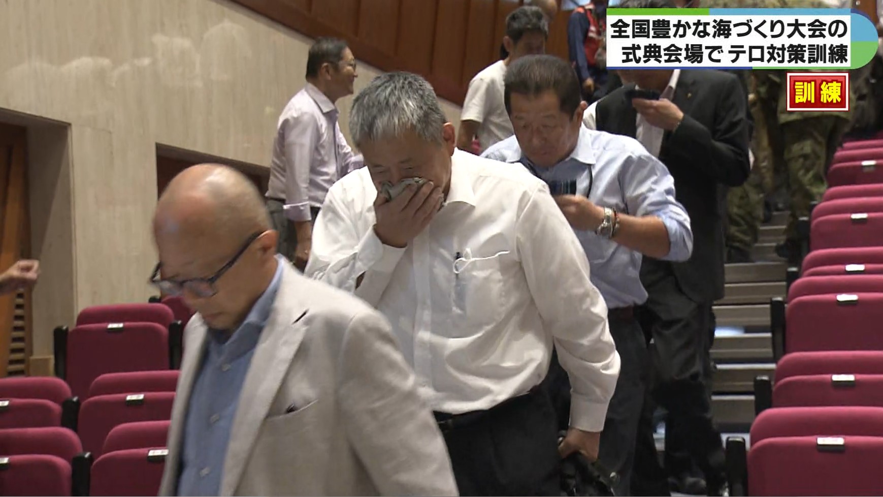 訓練は、式典の開催中に不審者がサリンと思われる液体が入ったペットボトルを投げつけたと想定して行われました。
