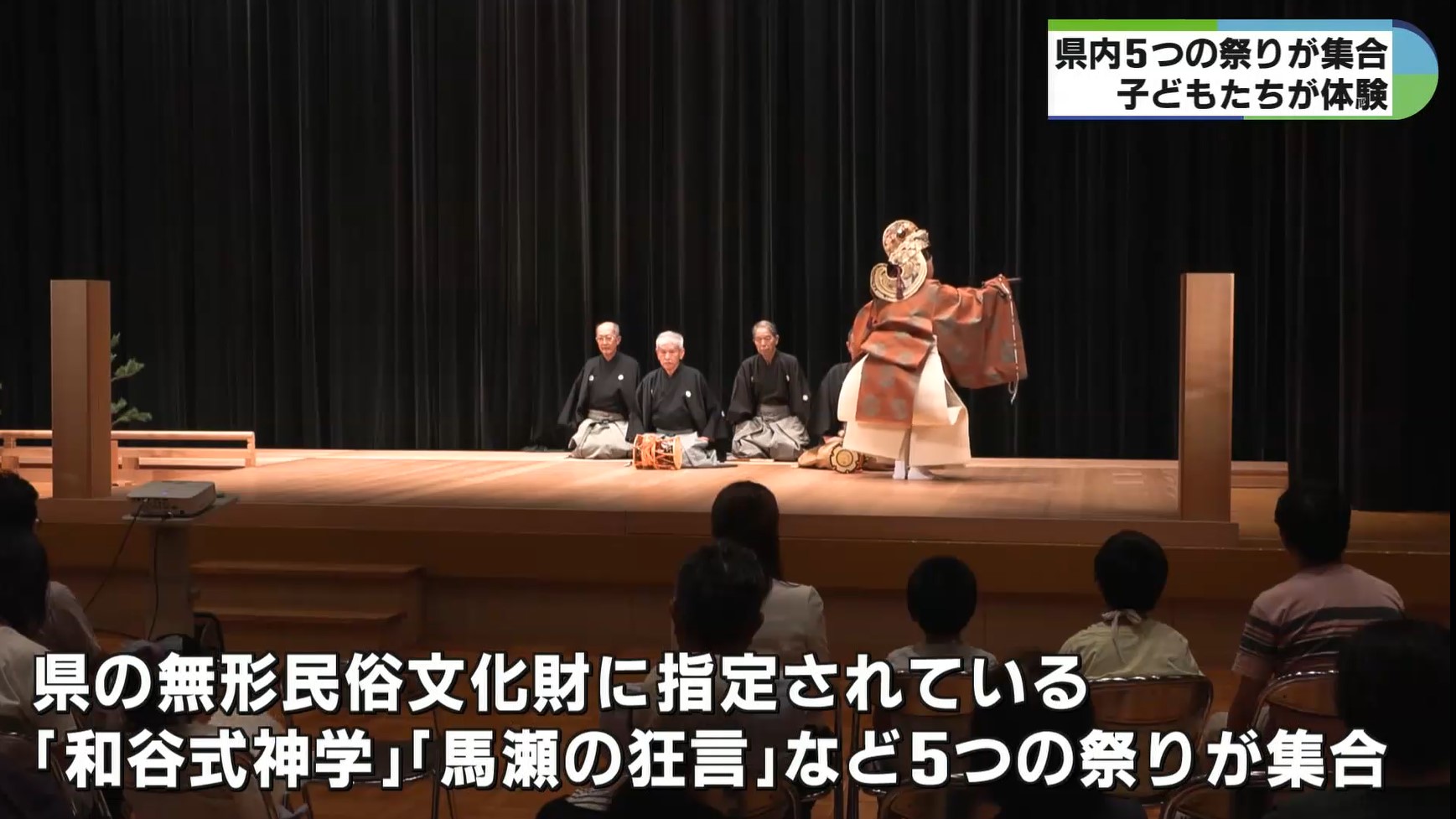 会場には県の無形民俗文化財に指定されている伊勢市一色町の「和谷式神楽」や、伊勢市馬瀬町の「馬瀬の狂言」など5つの祭りが集まり、参加した小中高生ら約30人は実際に祭りで使う能面や獅子頭をかぶったり太鼓をたたくなどして、実物に触れながら祭りを体験しました。