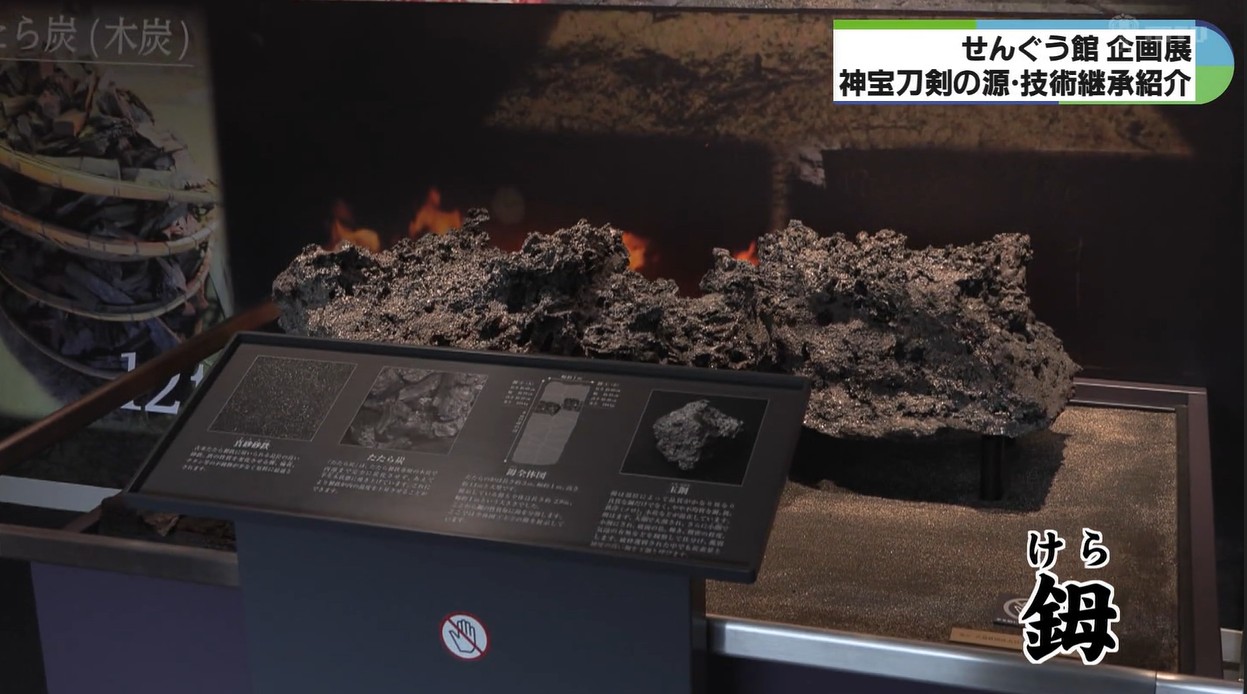 今回の展示では、刀剣類の原料となる「玉鋼」の母体「けら」に焦点を当て、御神宝の調製に必要な素材を確保することの重要性を伝えています。