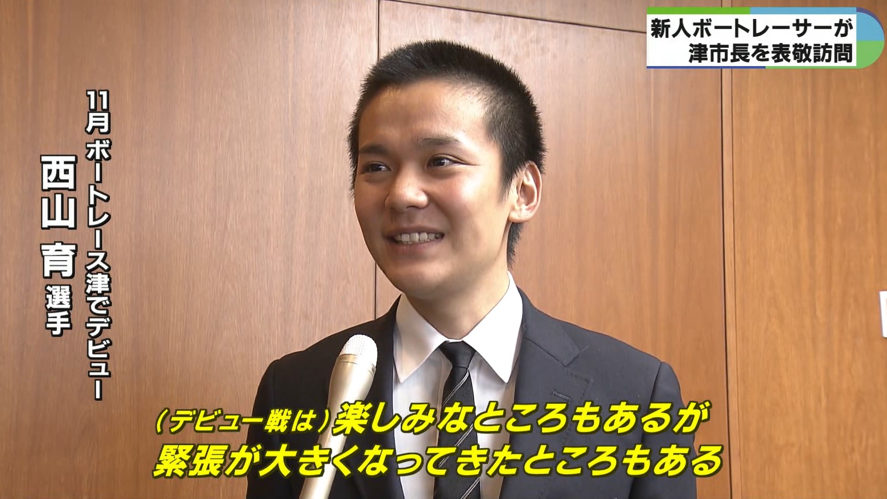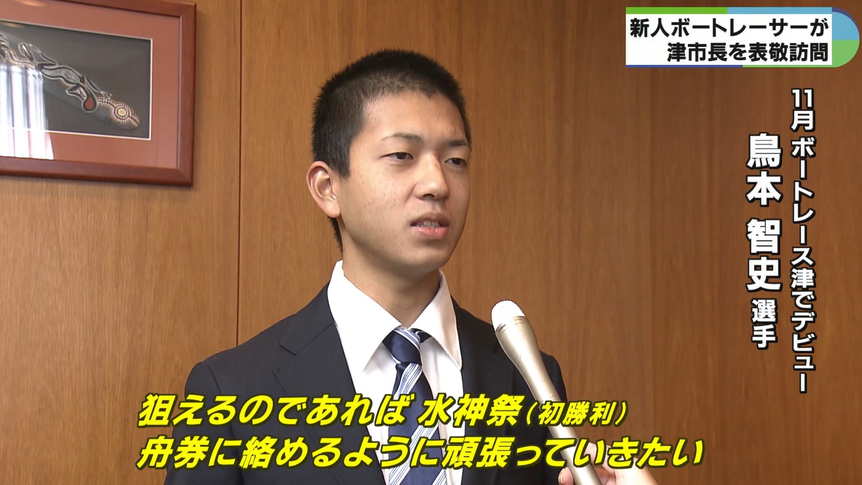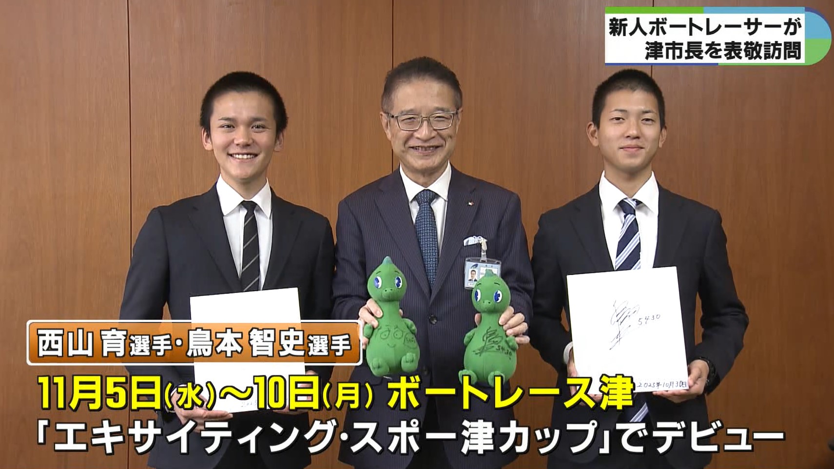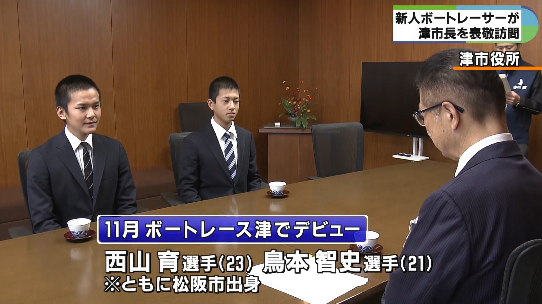 11月、三重県のボートレース津でデビューする新人ボートレーサー二人が、30日、津市役所を訪れ、前葉市長にレースへの意気込みを語りました。