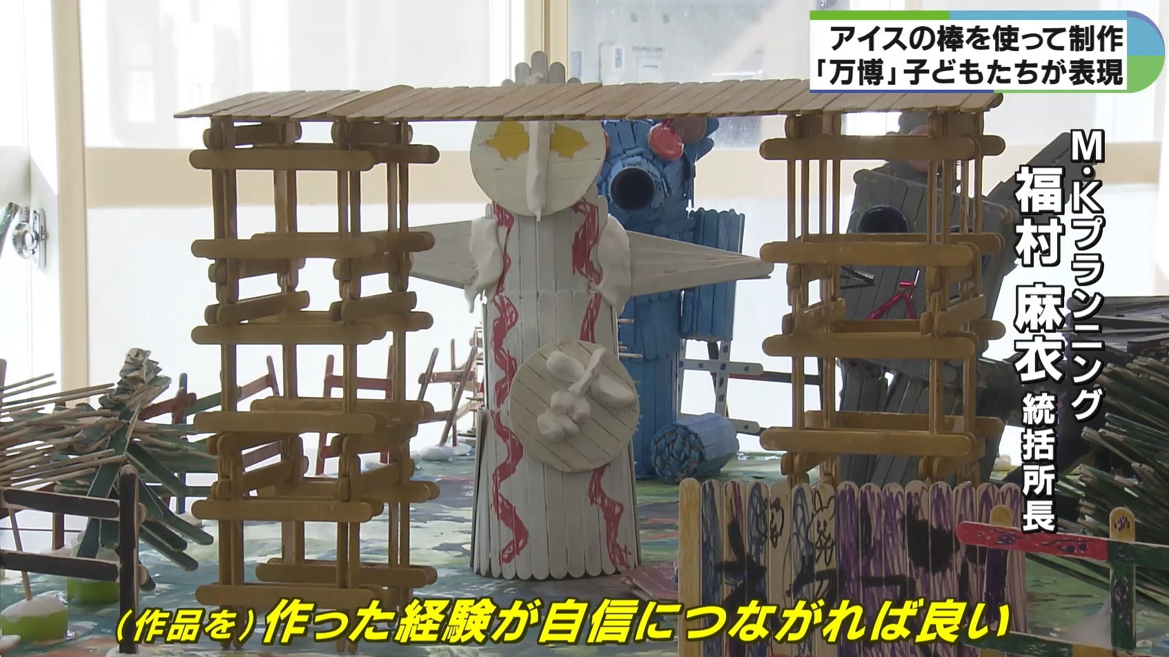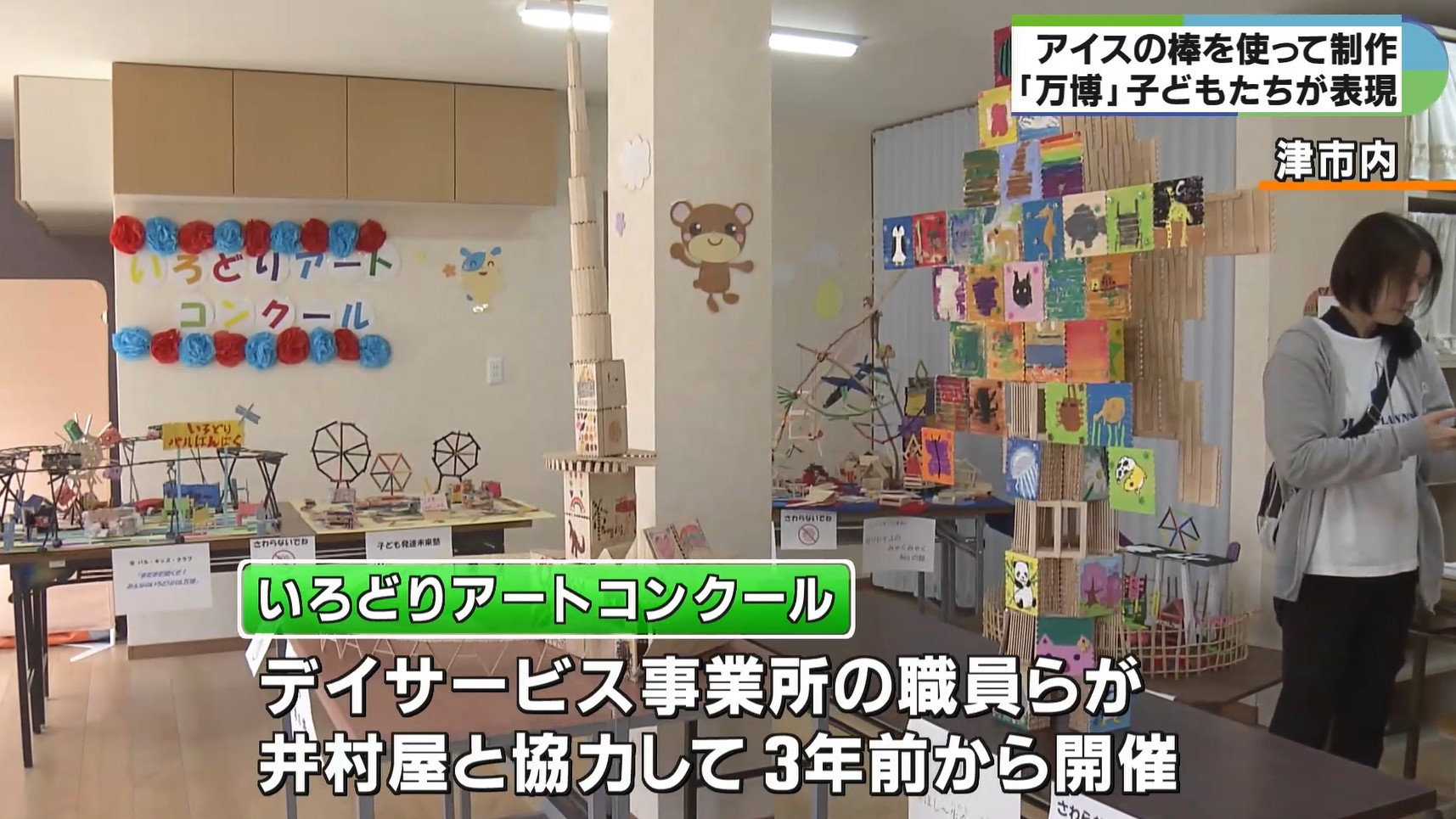 今回は20年ぶりに国内で開催された「万博」をテーマに、津市と松阪市にある16の事業所に通う小学1年生から高校3年生までの子どもたちが、井村屋から提供されたアイスの棒を使って自分たちが思い描くパビリオンやアトラクションなどを表現しました。