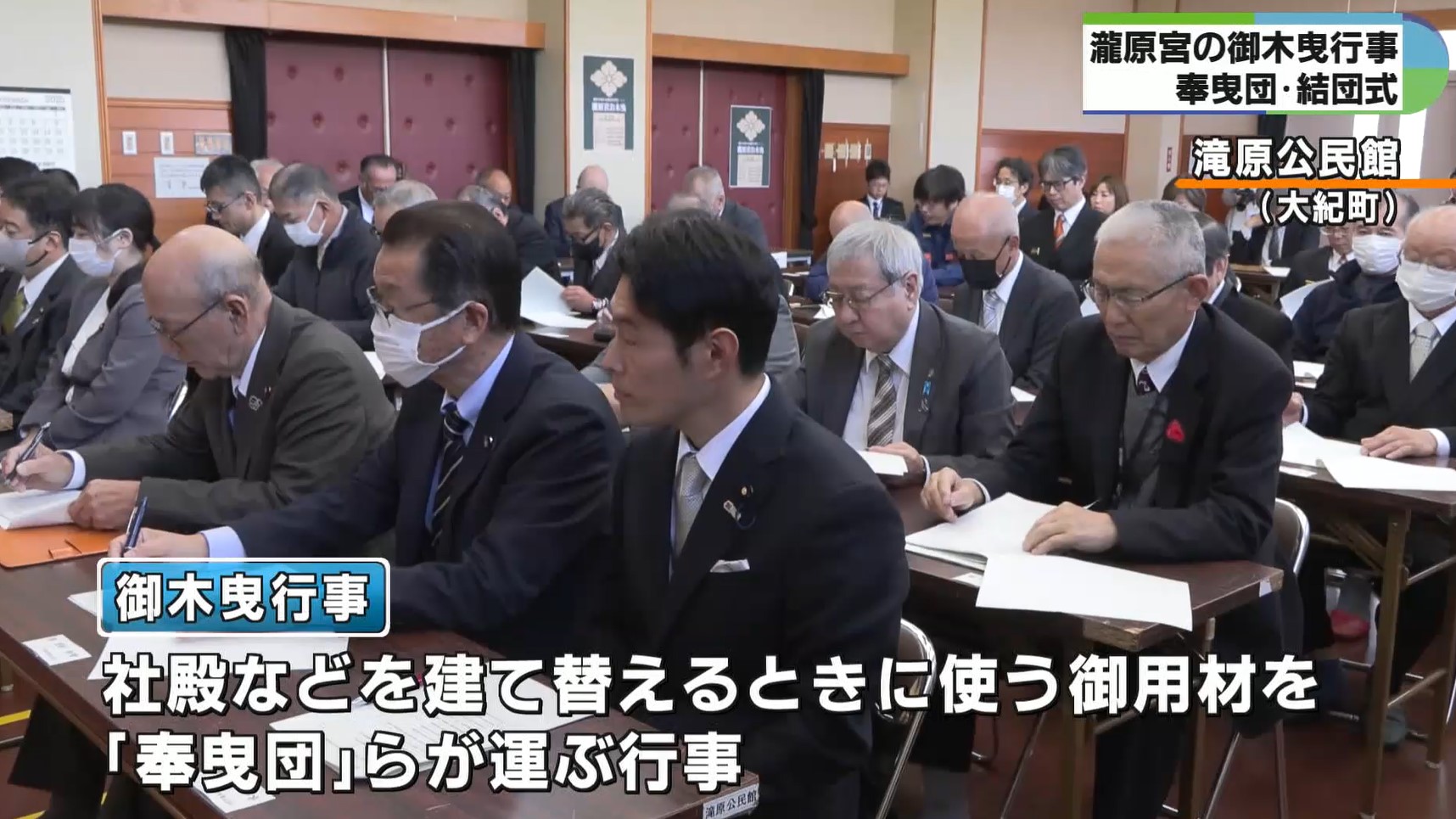 伊勢神宮の式年遷宮に向けて、伊勢神宮内宮の別宮、瀧原宮がある三重県大紀町で、10日、御木曳行事を行う奉曳団の結団式が行われました。