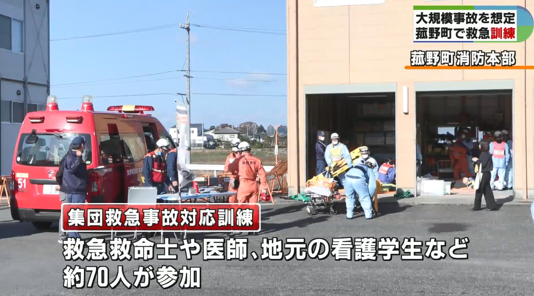 この訓練は、大規模な事故が発生した際に、安全な場所での応急処置や医療機関への救急搬送を迅速に行うことを目的に行われたもので、救急救命士や医師、地元の看護学生など約70人が参加しました。