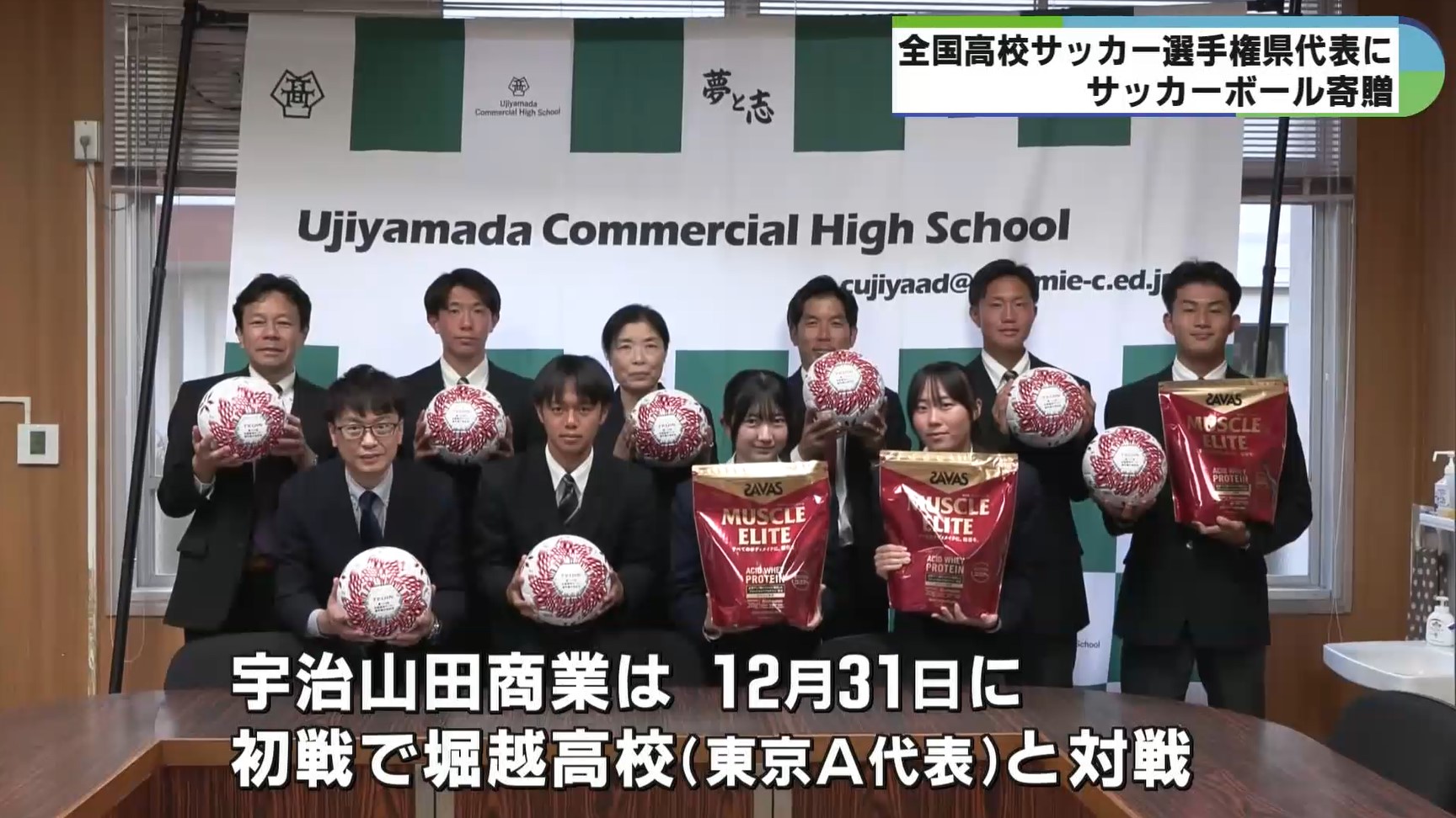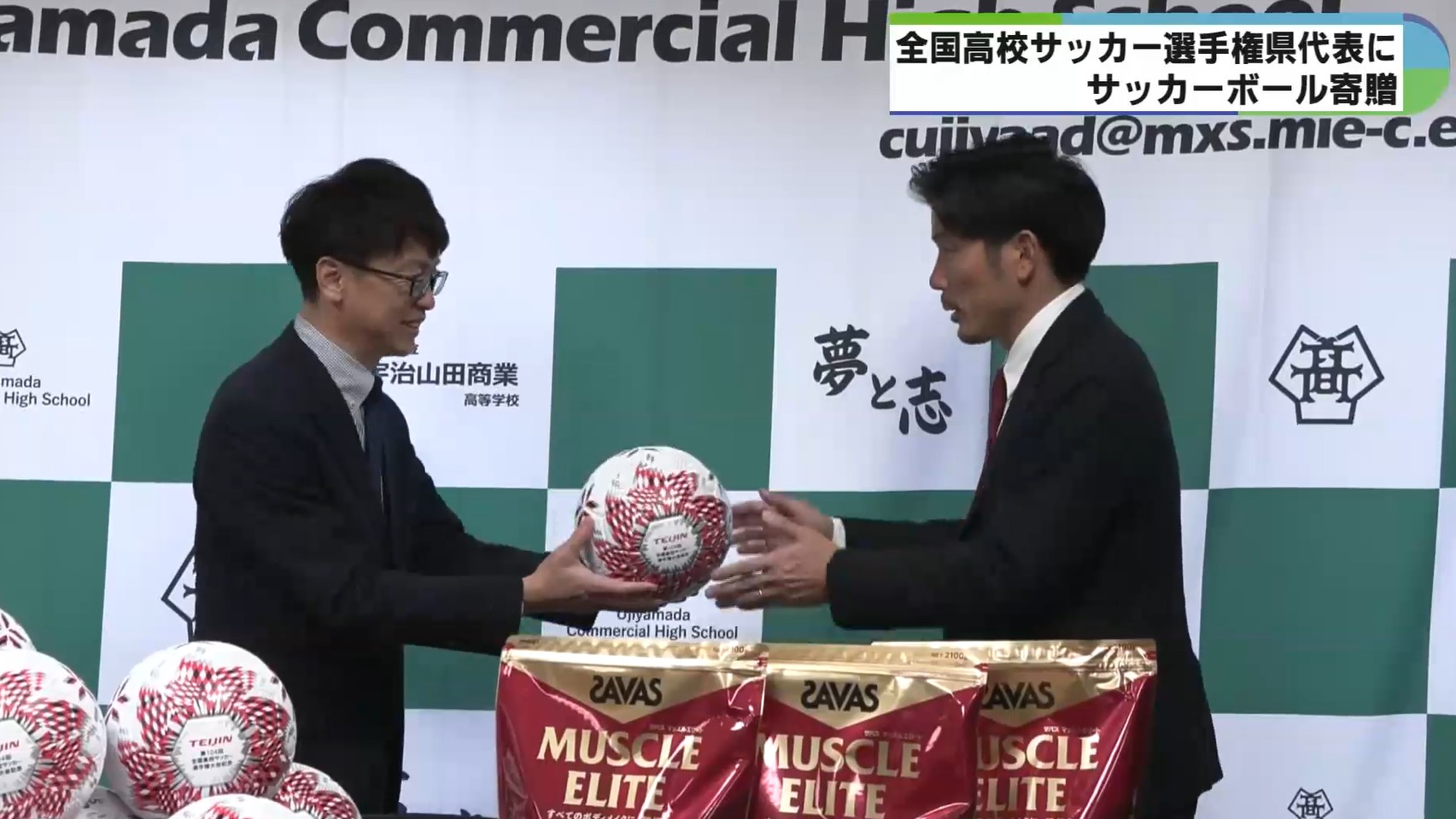 28日に開幕する全国高校サッカー選手権大会に出場する三重県代表の宇治山田商業高校に、1日、大会の協賛スポンサーのテイジンからサッカーボールが寄贈されました。