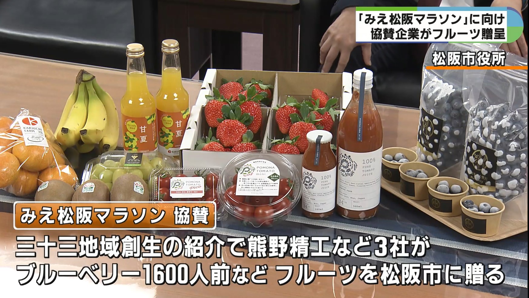 ランナーの完走や疲労回復を後押ししようと、三十三地域創生の紹介で熊野精工など3社からこの日、三重県産のブルーベリー1600人前、いちご4000個、シャインマスカット3000粒などのフルーツが松阪市へ贈られました。