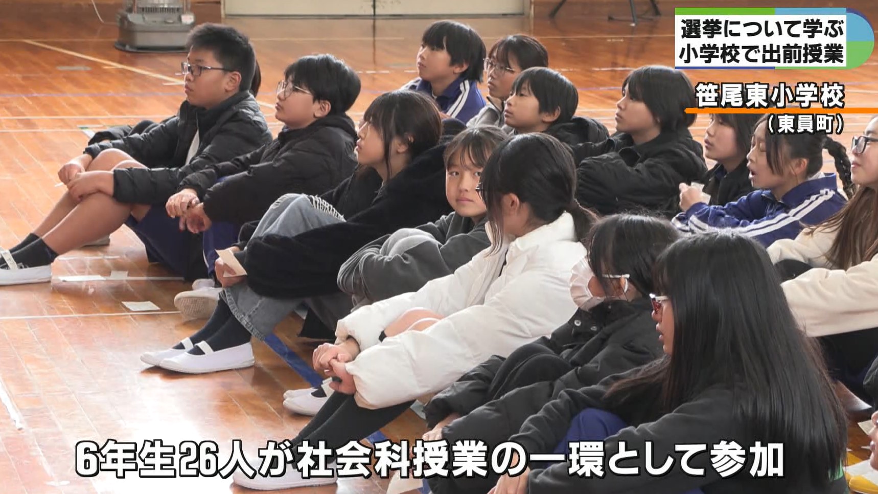 出前授業は、三重県選挙管理委員会などが行ったもので、東員町立笹尾東小学校の6年生26人が社会科の授業の一環として参加しました。