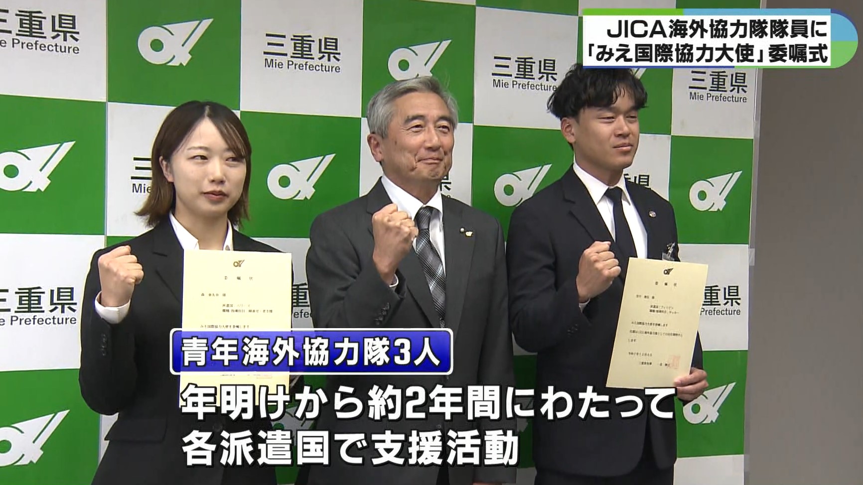 海外協力隊の一員として、途上国に派遣される三重県出身者に、三重県と派遣国の架け橋になってもらう「みえ国際協力大使」の委嘱式が三重県庁で開かれました。