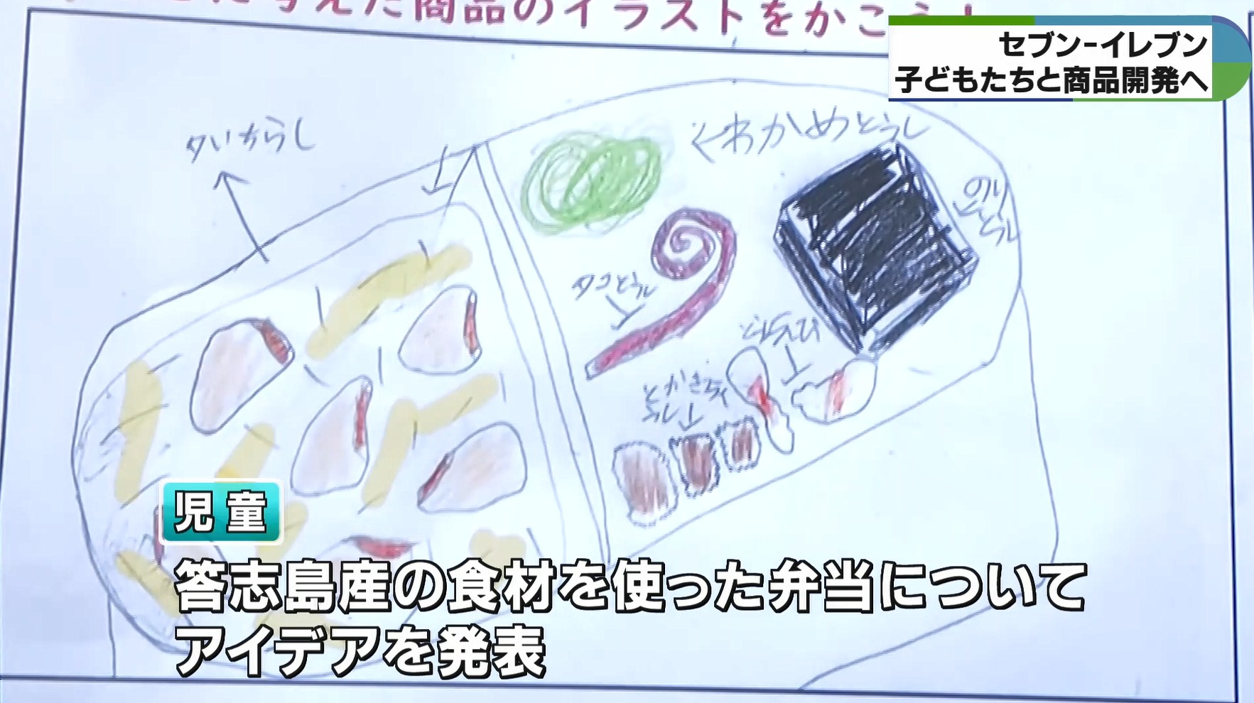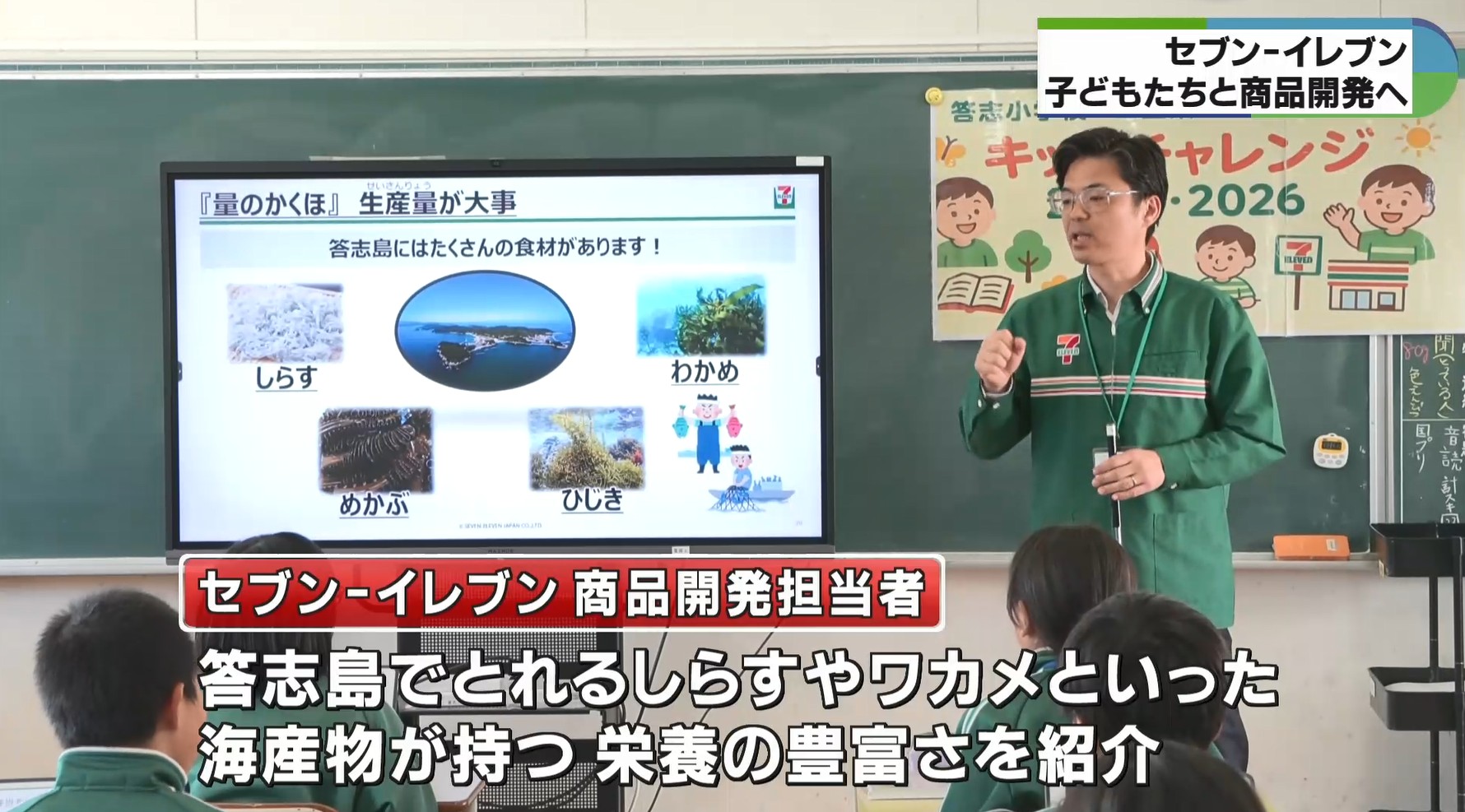 11日は三重県・フードイノベーション課の職員が地産地消について話した後、セブンーイレブンの商品開発・担当者が答志島でとれるしらすやワカメといった海産物が持つ、栄養の豊富さを紹介し、子どもたちが考える商品についての授業が行われました。