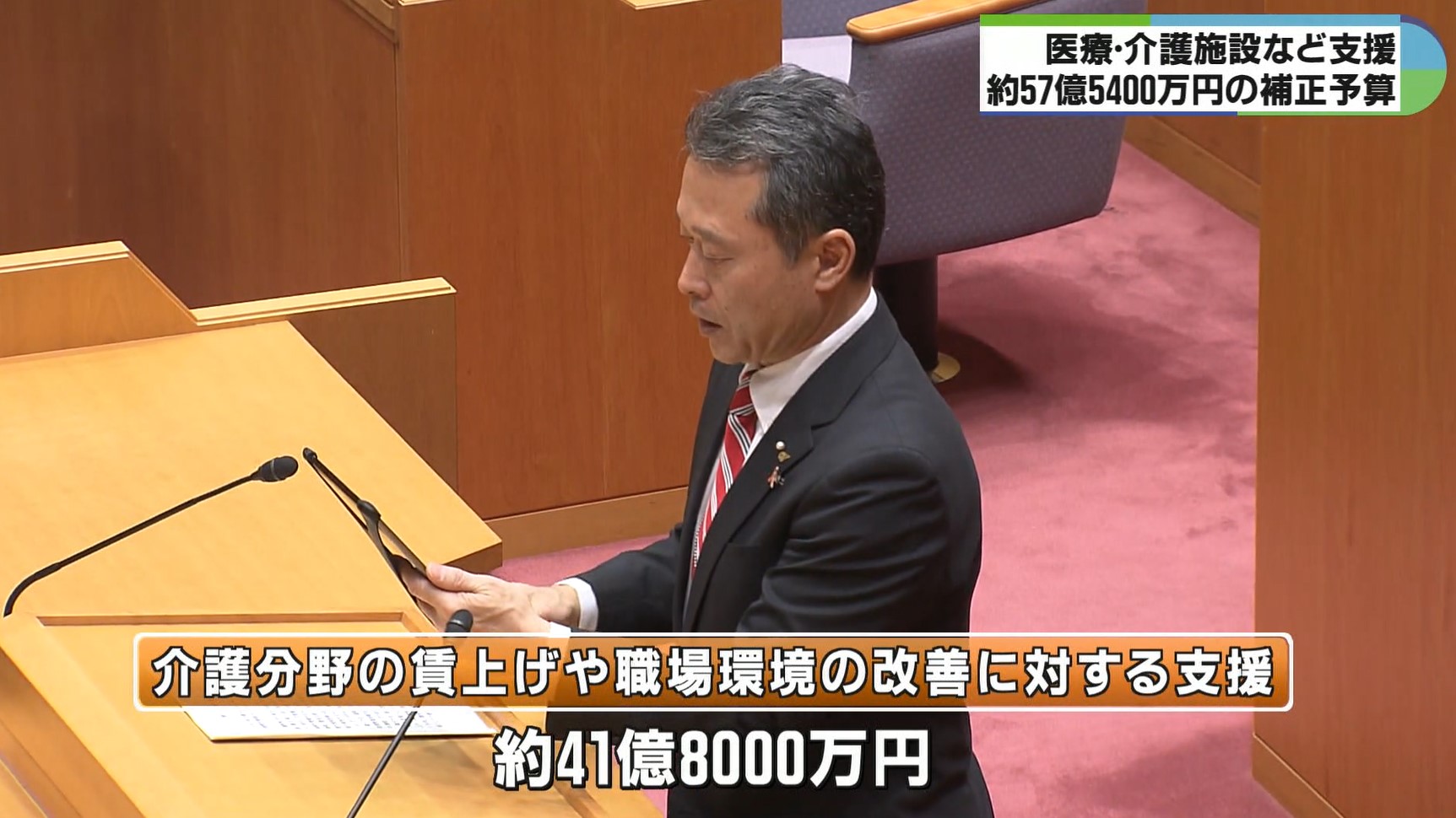 提出された約57億5400万円の補正予算案の内、介護分野で働く人の賃上げや職場環境の改善に対する支援として約41億8000万円が計上されています。