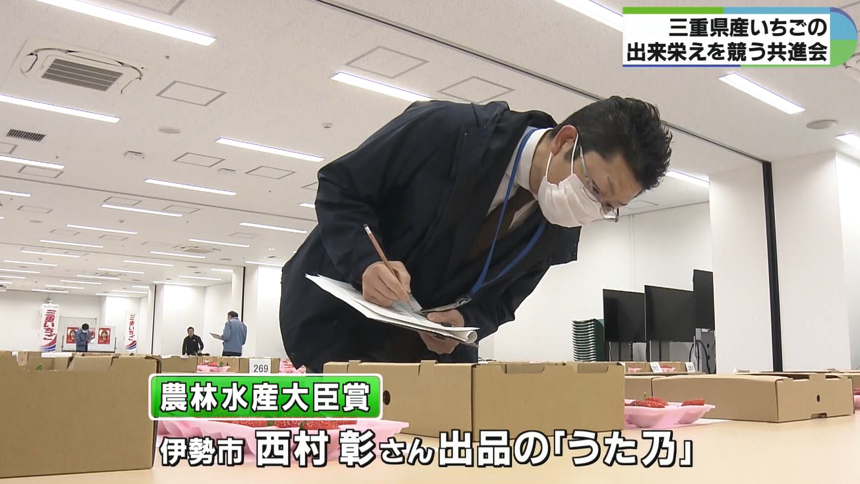 今年は猛暑や天候不順などの影響で生育の遅れなどが見られたものの、台風や病害虫の被害はなく、生産者の適正な管理の結果、例年通り品質の良いいちごが育っているということです。審査の結果、伊勢市の西村彰さんが出品した「うた乃」が最高位にあたる農林水産大臣賞に輝きました。