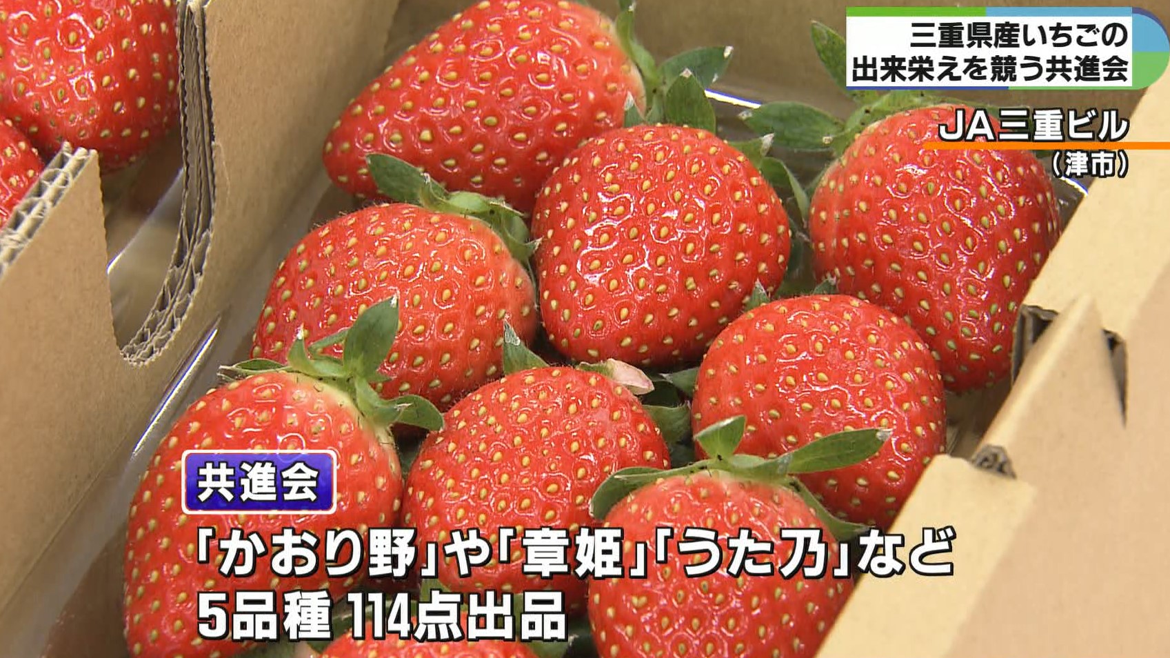 今年の共進会には、県内各地から酸味が柔らかで上品な香りが特長の「かおり野」をはじめ、粒が大きく甘みが濃い「章姫」や三重県で開発された赤みが鮮やかで糖度が高い「うた乃」など5品種114点が出品されました。
