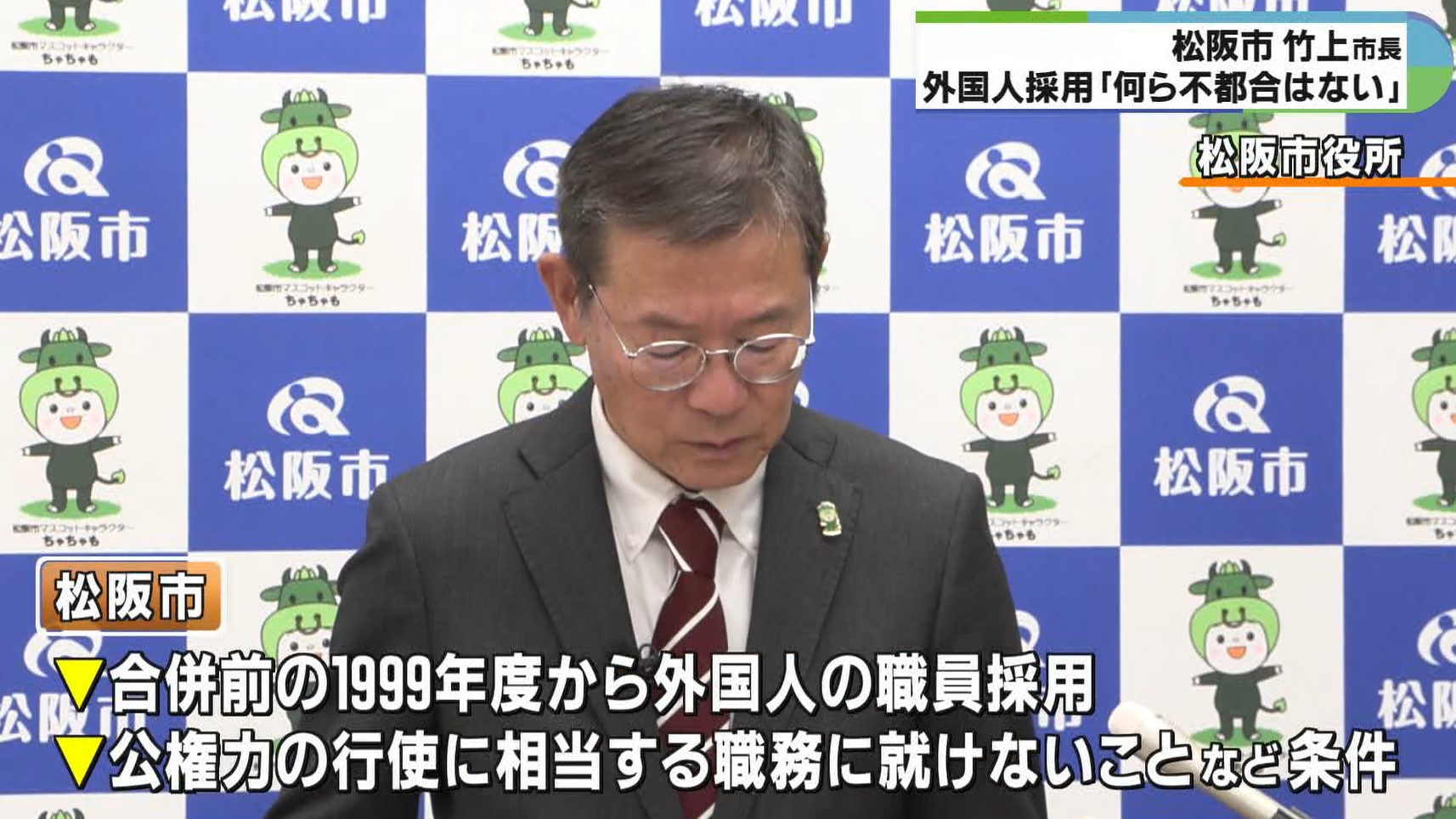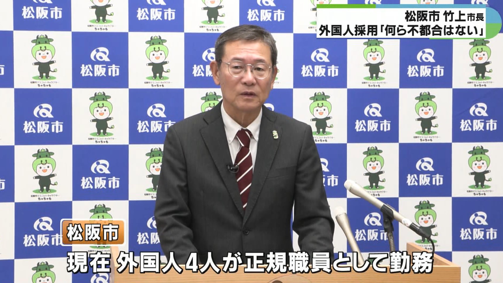 外国人の職員採用を行っている三重県松阪市の竹上真人市長は「今の状態で何ら不都合はないとして、外国人の採用について変える必要ない」と述べました。