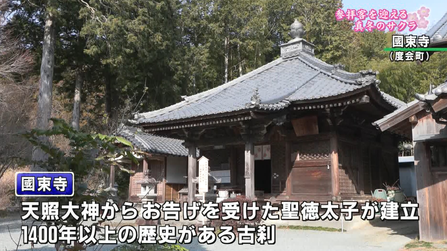 三重県度会町にある聖徳太子ゆかりの古刹、國束寺ではサクラの一種の十月桜が参拝者を迎えています。