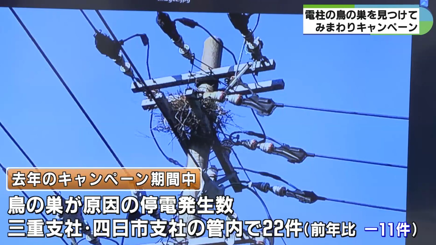 その結果、去年はキャンペーン期間中、鳥の巣による停電が三重支社と四日市支社の管内で22件と、おととしと比べて11件減少し、一定の効果がみられたということです。