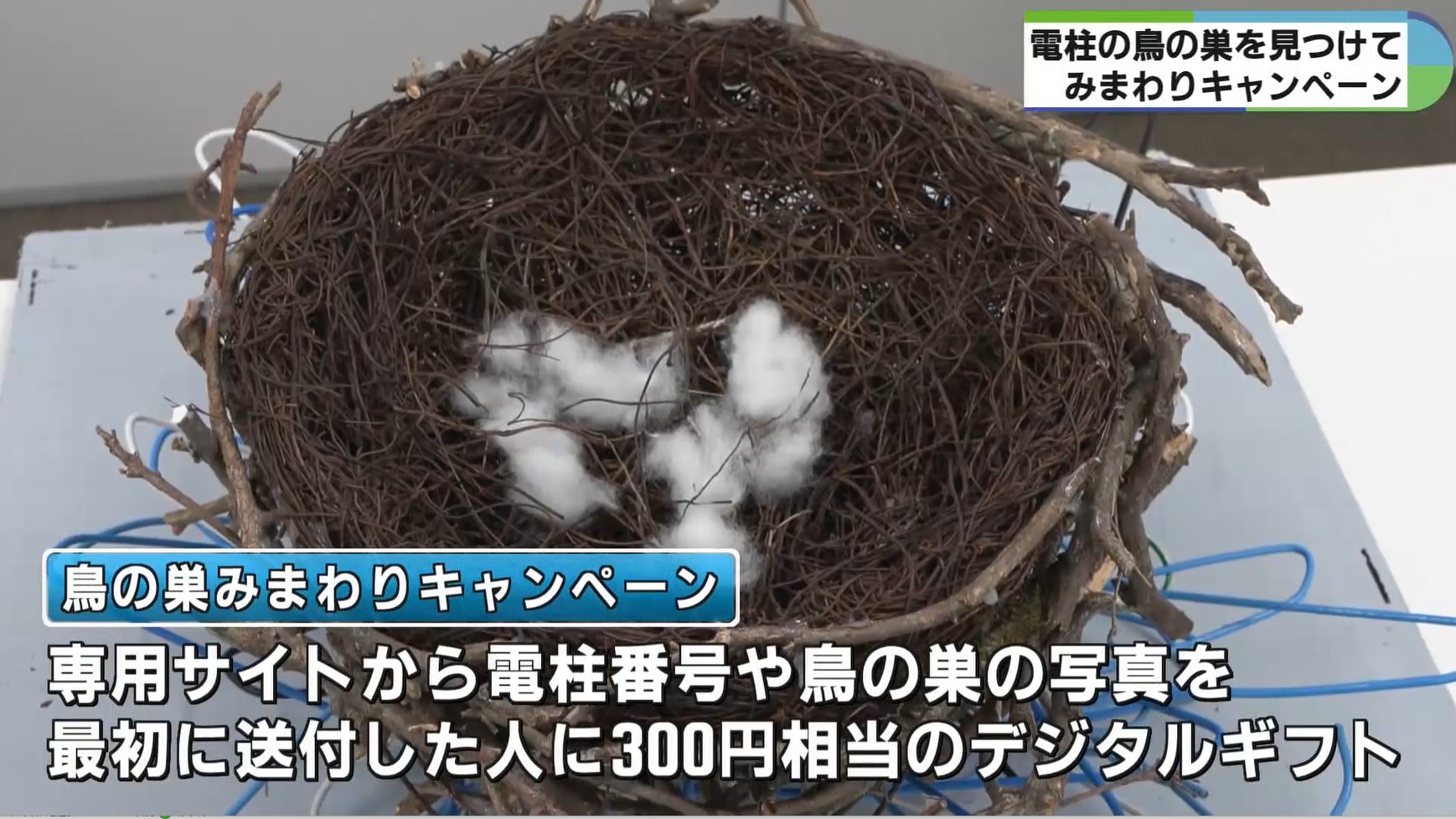 鳥の巣みまわりキャンペーンでは電柱につくられた巣を見つけた際、専用サイトから電柱に記されている電柱番号や鳥の巣の写真を最初に送付した人に、300円相当のデジタルギフトが贈られます。