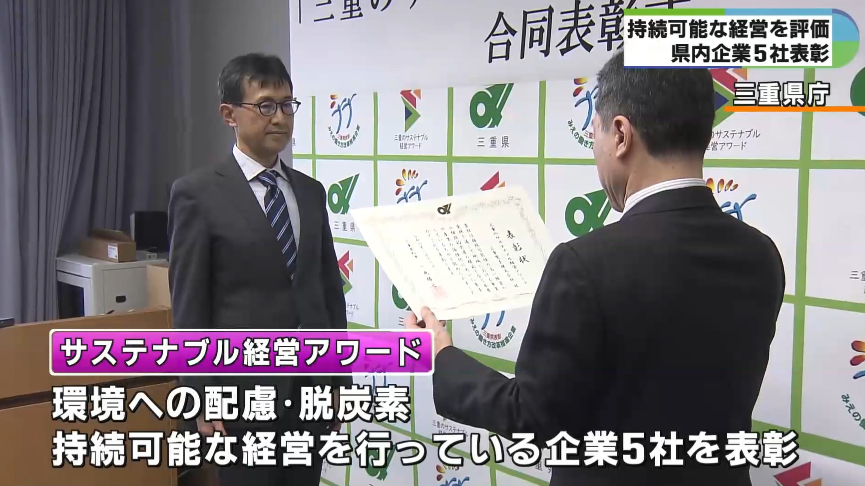 三重県内の環境への配慮や次世代育成の推進など、持続可能な経営を行っている企業に対する表彰式が16日、三重県庁で開かれました。