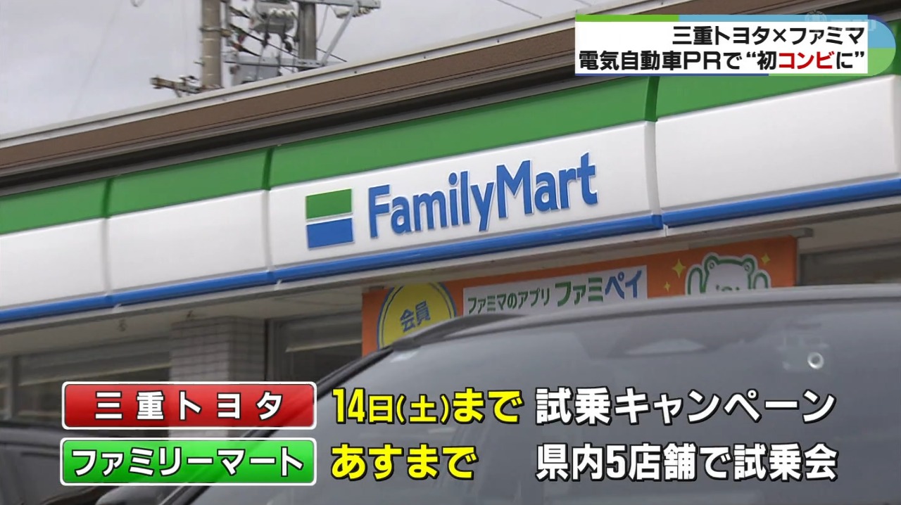 三重トヨタとファミリーマートが展開している、環境に配慮した電気自動車の普及キャンペーンの一環で、6日、県内のファミリーマートの店舗で電気自動車の試乗会が行われました。