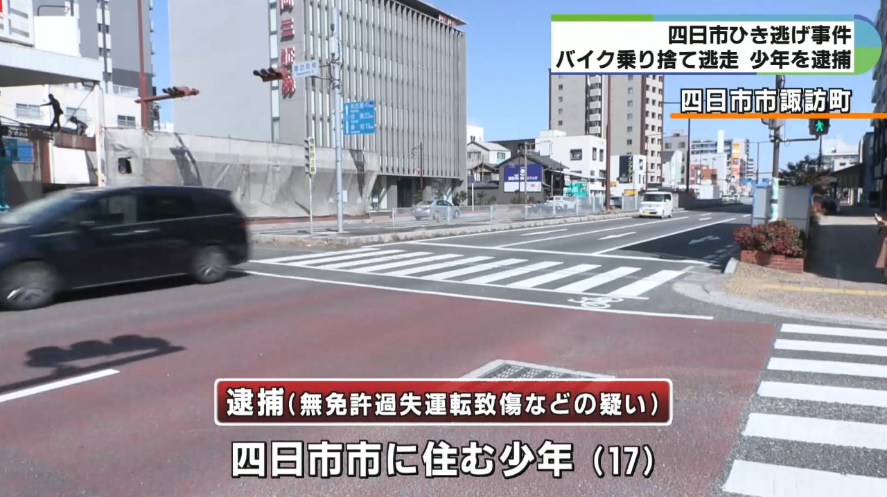 10日夜、四日市市の国道1号線で横断歩道を渡っていた男性がバイクにはねられ大けがをしたひき逃げ事件で、現場にバイクを乗り捨て逃走した17歳の少年が逮捕されました。