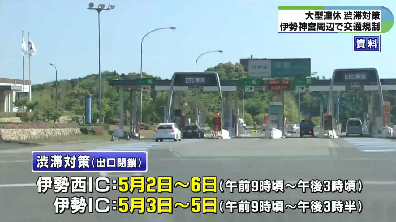 このため伊勢市内では、神宮周辺道路の渋滞対策として、5月2日から6日まで大規模な交通規制が行われ、伊勢神宮の内宮と外宮に近い、伊勢自動車道下り線の伊勢西ICと伊勢ICの出口が閉鎖されます。