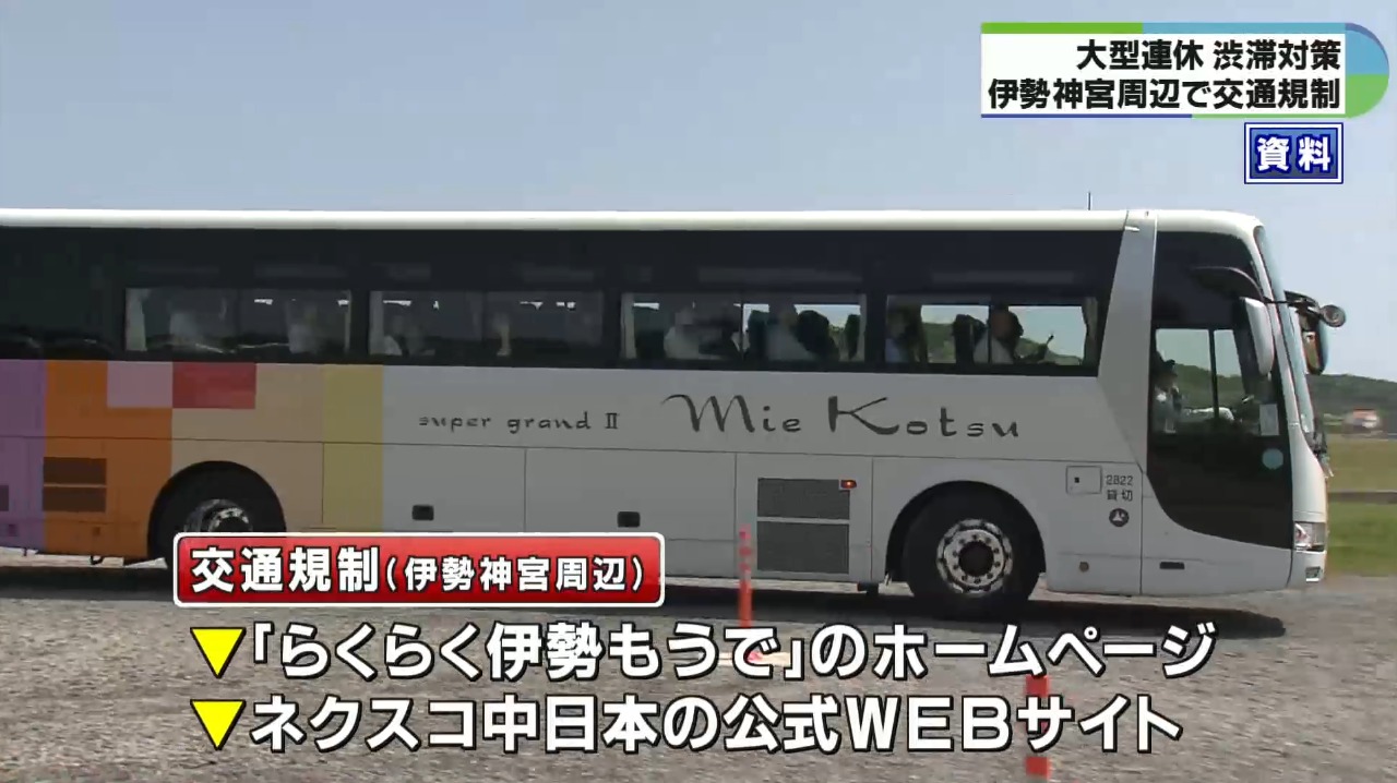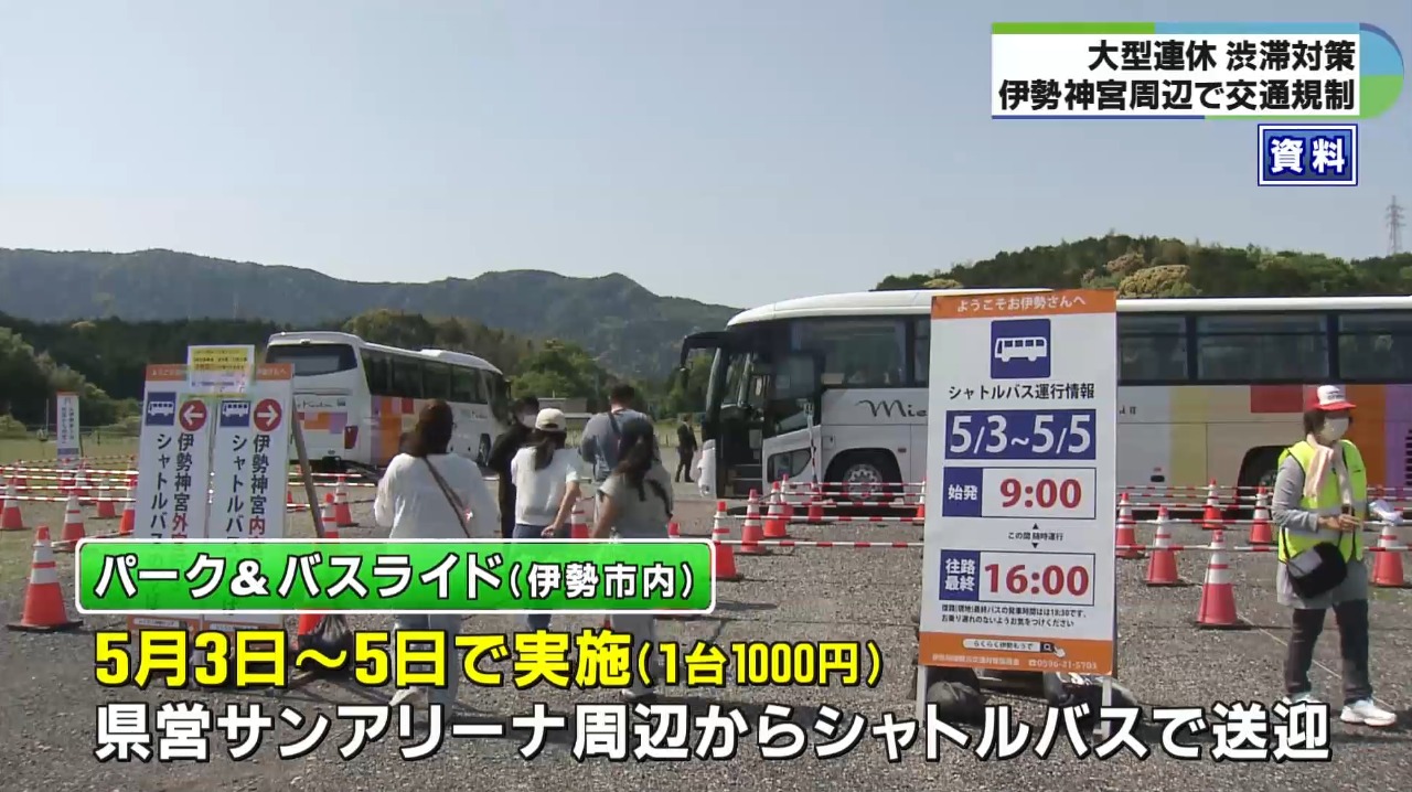 また、5月3日から5日にかけては、伊勢神宮へ向かう車を県営サンアリーナ周辺の臨時駐車場へ誘導し、シャトルバスで外宮や内宮周辺まで送迎するパーク&バスライドが実施されます。